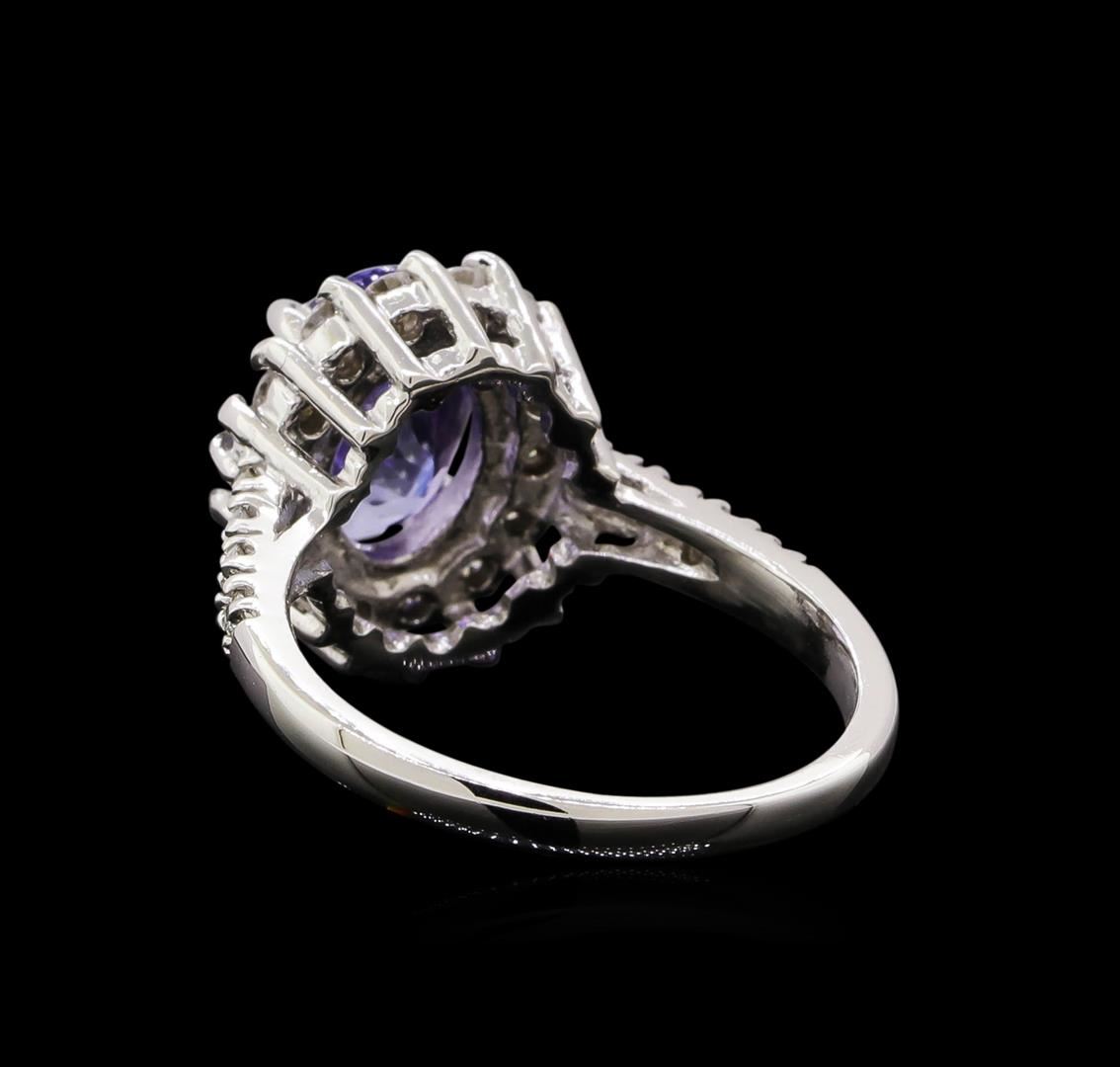 One electronically tested 14KT white gold ladies cast tanzanite and diamond ring with a bright polish finish. Identified with markings of "14K". Condition is new. Containing: One prong set oval modified brilliant cut natural tanzanite, measuring 9.50 x 7.50 x 5.60mm, approximate weight of 2.81ct., clarity is eye clean, type I, medium light, very slightly grayish, violet color, (GIA V 4/3), cut is good. Twenty-Two prong set round brilliant cut diamonds, measuring 1.90 - 1.50 x 1.02mm (depth est.) approximate total weight of 22 Stones = 0.39ct. Clarity: SI-1 to SI-2. Color: H - I, Cut is Good. Colored gemstones are presumed to have been subjected to commonly used enhancement processes. All diamonds and colored gemstones are graded in the mounting, unless otherwise stated. Total Weight of Colored Stones 2.81ct. Total Weight of Diamonds 0.39ct. Total Weight of Ring 5.40 grams. GGL Appraised at $4,210.00.
