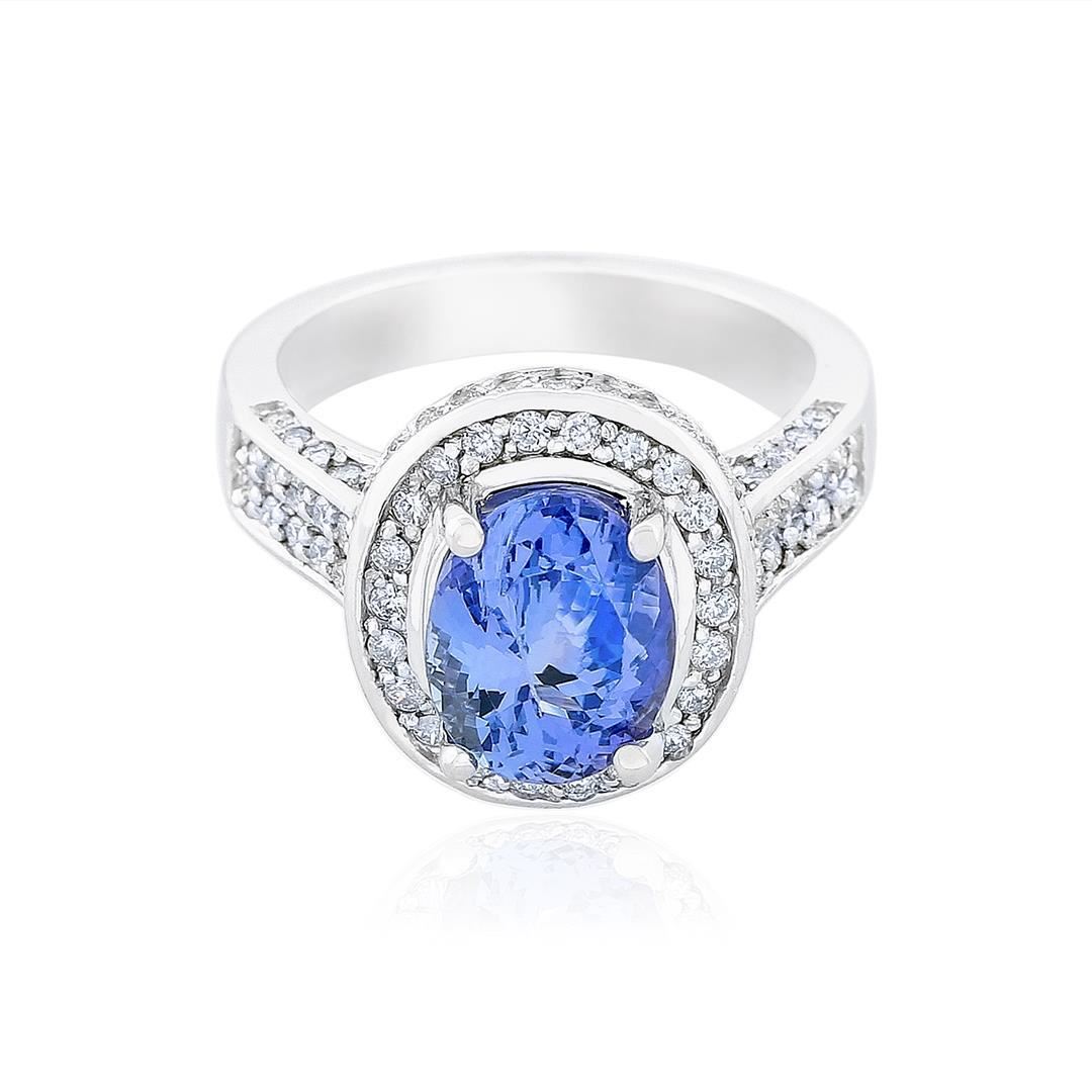 One electronically tested 14KT white gold ladies cast tanzanite and diamond ring with a bright polish finish. Identified with markings of "14K". Condition is new. Containing: One prong set oval modified brilliant cut natural tanzanite, measuring 10.00. x 7.80 x 4.90mm, approximate weight of 2.81ct., clarity is eye clean, type I, medium light, very slightly grayish, violet color, (GIA V 4/3), cut is good. The stone has been heat treated to improve the color. Ninety prong set round brilliant cut diamonds, measuring 1.30 - 1.10 x 0.72mm (depth est.) approximate total weight of 90 Stones = 0.73ct. Clarity: SI-2 to I-2. Color: H - I, Cut is Good. Colored gemstones are presumed to have been subjected to commonly used enhancement processes. All diamonds and colored gemstones are graded in the mounting, unless otherwise stated. Total Weight of Colored Stones 2.81ct. Total Weight of Diamonds 0.73ct. Total Weight of Ring 7.00. grams.
