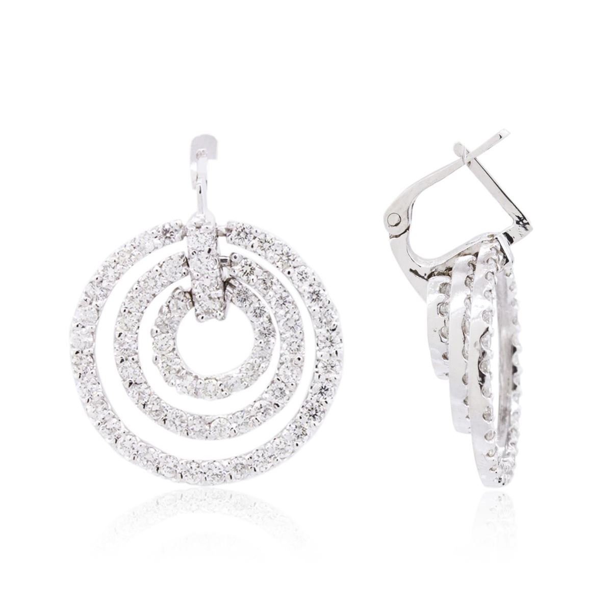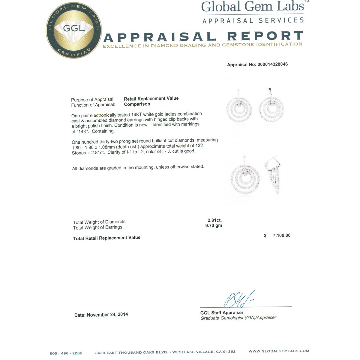 One pair electronically tested 14KT white gold ladies combination cast & assembled diamond earrings with hinged clip backs with a bright polish finish. Identified with markings of "14K". Condition is new. Containing: One Hundred Thirty-Two prong set round brilliant cut diamonds, measuring 1.80 - 1.80 x 1.08mm (depth est.) approximate total weight of 132 Stones = 2.81ct. Clarity: I-1 to I-2. Color: I - J, Cut is Good. All diamonds are graded in the mounting, unless otherwise stated. Total Weight of Diamonds 2.81ct. Total Weight of Earrings 9.70 grams. GGL Appraised at $7,100.00.