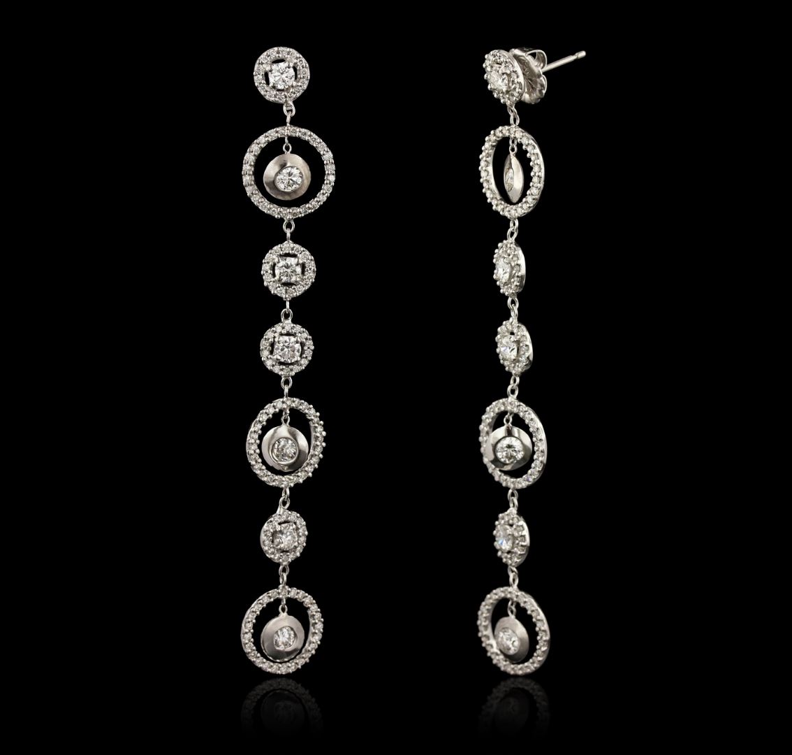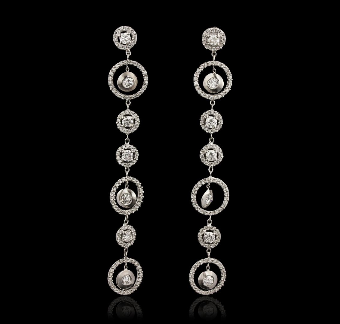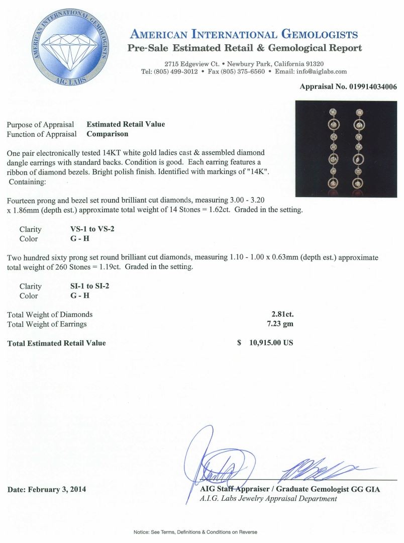 One pair electronically tested 14KT White Gold ladies cast & assembled diamond dangle earrings with standard backs. Condition is good. Each earring features a ribbon of diamond bezels. Bright polish finish. Identified with markings of "14K". Containing: Fourteen prong and bezel set round brilliant cut diamonds, measuring 3.00 - 3.20 x 1.86mm (depth est.) approximate. Total Weight of 14 Stones = 1.62ct. Graded in the setting. Clarity: VS-1 to VS-2 . Color: G - H. Two Hundred Sixty prong set round brilliant cut diamonds, measuring 1.10 - 1.00 x 0.63mm (depth est.) approximate. Total Weight of 260 Stones = 1.19ct. Graded in the setting. Clarity: SI-1 to SI-2 . Color: G - H. Total Weight of Diamonds 2.81ct. Total Weight of Earrings 7.23 grams. AIG Appraised at $10,915.00.