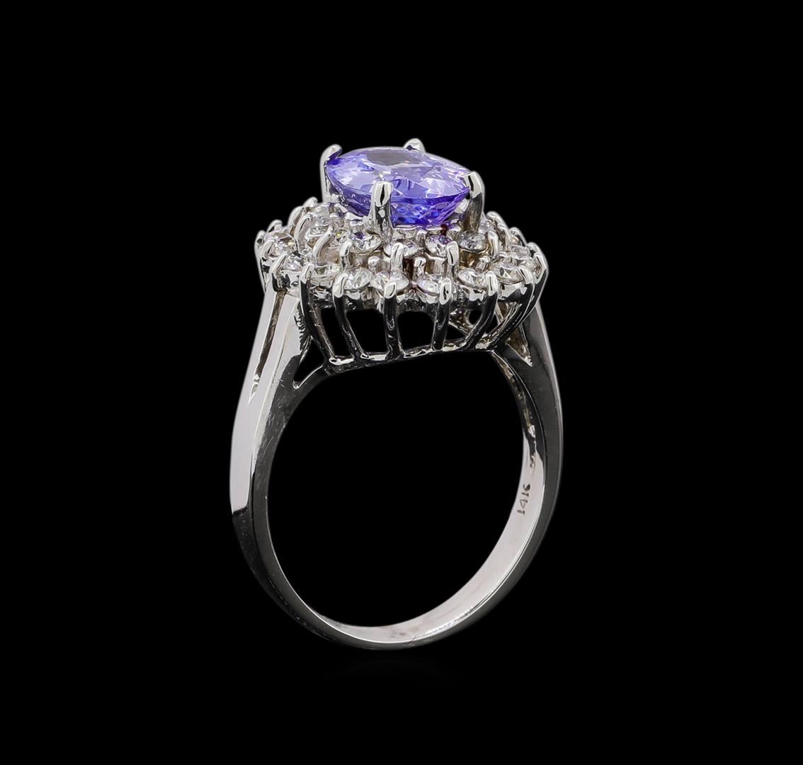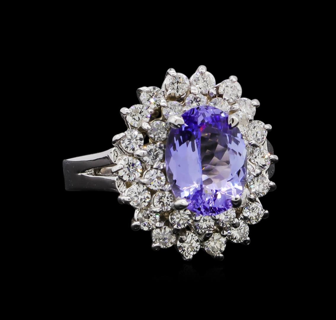 One electronically tested 14KT white gold ladies cast tanzanite and diamond ring with a bright polish finish. Identified with markings of "14K". Condition is new. Containing: One prong set oval modified brilliant cut natural tanzanite, measuring 9.50 x 7.30 x 5.78mm, approximate weight of 2.82ct., clarity is eye clean, type I, medium light, very slightly grayish, violet color, (GIA V 4/3), cut is good. Thirty-Two prong set round brilliant cut diamonds, measuring 1.80 - 1.50 x 0.99mm (depth est.) approximate total weight of 32 Stones = 0.53ct. Clarity: SI-1 to I-1. Color: I - J, Cut is Good. Colored gemstones are presumed to have been subjected to commonly used enhancement processes. All diamonds and colored gemstones are graded in the mounting, unless otherwise stated. Total Weight of Colored Stones 2.82ct. Total Weight of Diamonds 0.53ct. Total Weight of Ring 5.80 grams. GGL Appraised at $3,835.00.