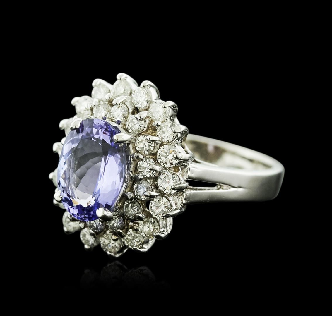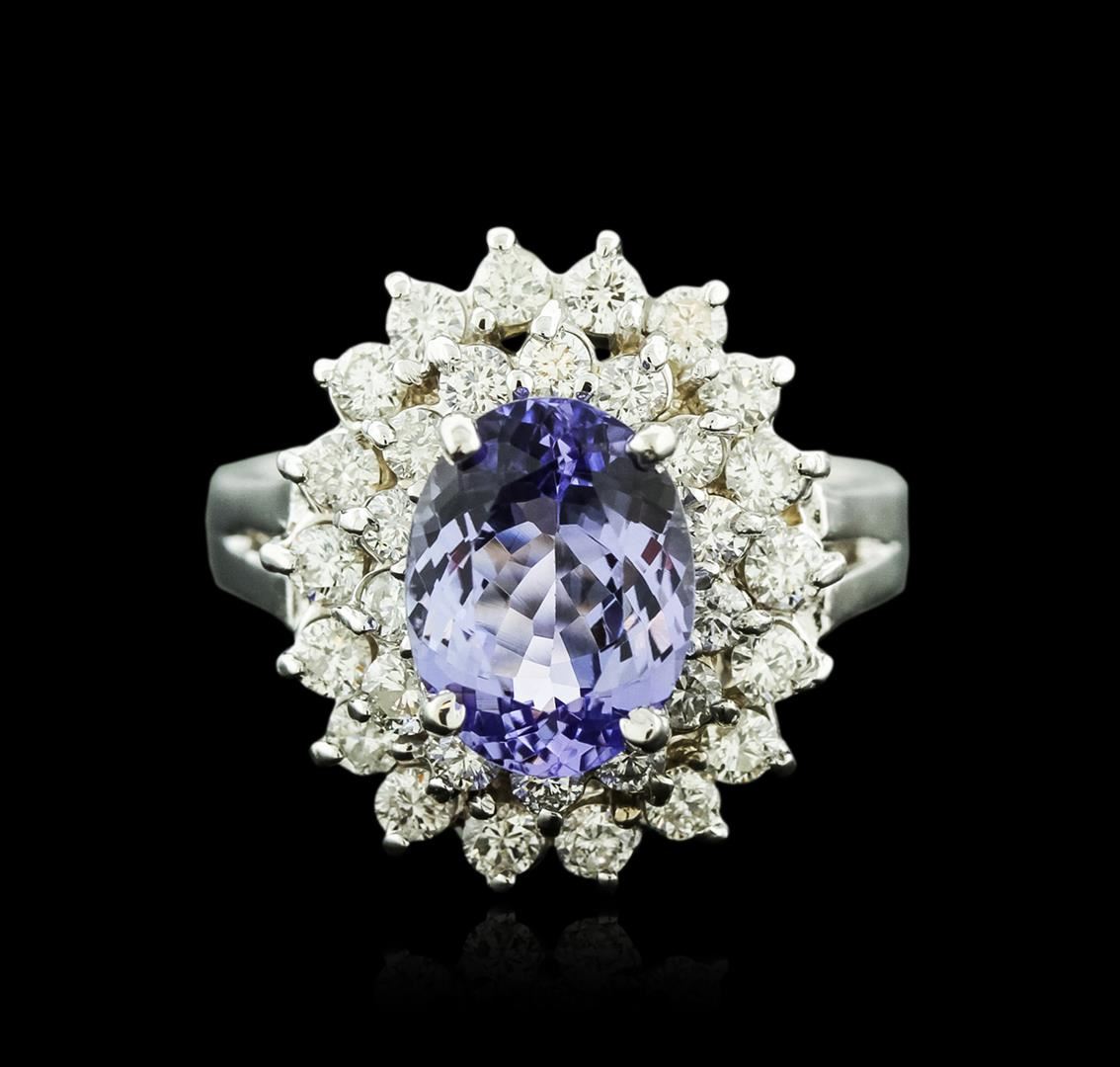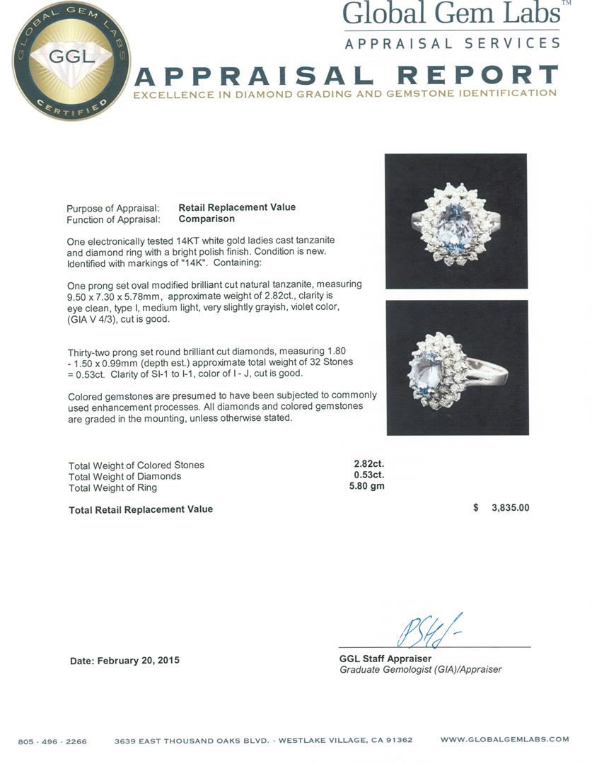 One electronically tested 14KT white gold ladies cast tanzanite and diamond ring with a bright polish finish. Identified with markings of "14K". Condition is new. Containing: One prong set oval modified brilliant cut natural tanzanite, measuring 9.50 x 7.30 x 5.78mm, approximate weight of 2.82ct., clarity is eye clean, type I, medium light, very slightly grayish, violet color, (GIA V 4/3), cut is good. Thirty-Two prong set round brilliant cut diamonds, measuring 1.80 - 1.50 x 0.99mm (depth est.) approximate total weight of 32 Stones = 0.53ct. Clarity: SI-1 to I-1. Color: I - J, Cut is Good. Colored gemstones are presumed to have been subjected to commonly used enhancement processes. All diamonds and colored gemstones are graded in the mounting, unless otherwise stated. Total Weight of Colored Stones 2.82ct. Total Weight of Diamonds 0.53ct. Total Weight of Ring 5.80 grams. GGL Appraised at $3,835.00.