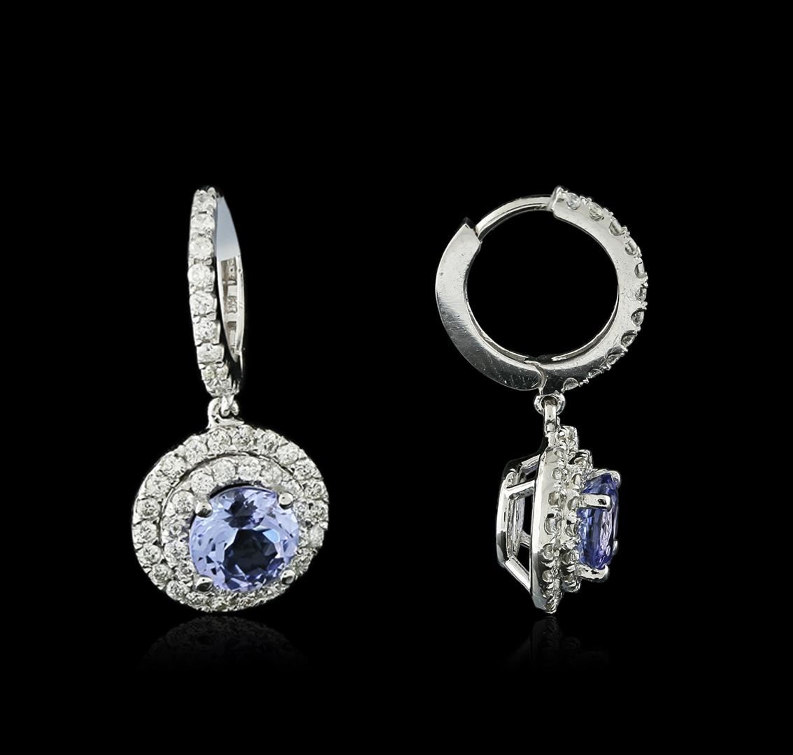 One pair electronically tested 14KT white gold ladies cast tanzanite and diamond earrings with hinged clip backs with a bright polish finish. Identified with markings of "14K". Condition is new. Containing: Two prong set round modified brilliant cut natural tanzanites, measuring 6.90 - 6.90 x 4.49 mm, approximate total weight of 2.83ct., clarity is eye clean, type I, medium light, very slightly grayish, violet color, (GIA V 4/3), cut is good. Ninety-Eight prong set round brilliant cut diamonds, measuring 1.40 - 1.40 x 0.84mm (depth est.) approximate total weight of 98 Stones = 1.30ct. Clarity: SI-1 to SI-2. Color: I - J, Cut is Good. Colored gemstones are presumed to have been subjected to commonly used enhancement processes. All diamonds and colored gemstones are graded in the mounting, unless otherwise stated. Total Weight of Colored Stones 2.83ct. Total Weight of Diamonds 1.30ct. Total Weight of Earrings 6.50 grams. GGL Appraised at $4,650.00.