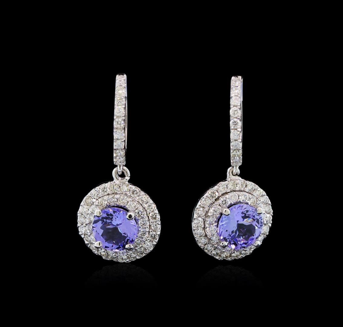 One pair electronically tested 14KT white gold ladies cast tanzanite and diamond earrings with hinged clip backs with a bright polish finish. Identified with markings of "14K". Condition is new. Containing: Two prong set round modified brilliant cut natural tanzanites, measuring 6.90 - 6.90 x 4.49 mm, approximate total weight of 2.83ct., clarity is eye clean, type I, medium light, very slightly grayish, violet color, (GIA V 4/3), cut is good. Ninety-Eight prong set round brilliant cut diamonds, measuring 1.40 - 1.40 x 0.84mm (depth est.) approximate total weight of 98 Stones = 1.30ct. Clarity: SI-1 to SI-2. Color: I - J, Cut is Good. Colored gemstones are presumed to have been subjected to commonly used enhancement processes. All diamonds and colored gemstones are graded in the mounting, unless otherwise stated. Total Weight of Colored Stones 2.83ct. Total Weight of Diamonds 1.30ct. Total Weight of Earrings 6.50 grams. GGL Appraised at $4,650.00.