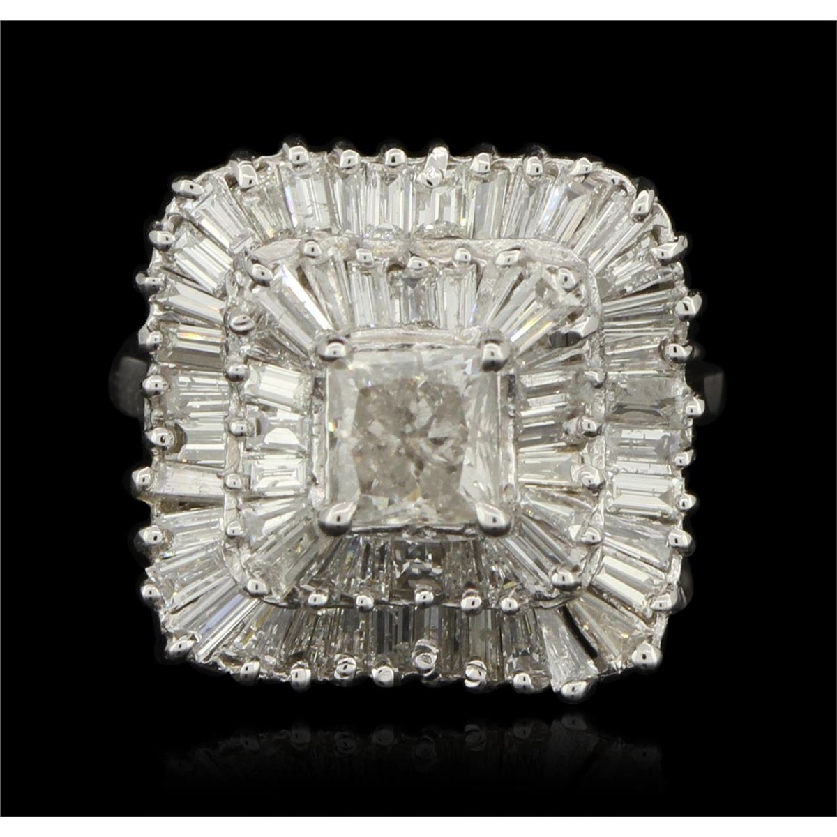New Condition! One electronically tested 14KT white gold Ladies combination cast & assembled ballerina ring with a bright polish finish. Identified with markings of "14K". Condition is excellent. Containing: One prong set princess cut diamond, measuring 5.23 x 5.10 x 3.64mm (depth est.) approximate weight of 0.80ct. Clarity of I-2 to I-3, Color of G - H. Fifty prong set baguette cut diamonds, measuring 2.40 x 1.50 x 1.28mm (depth est.) approximate total weight of 50 Stones = 2.03ct. Clarity of VS-1 to VS-2, Color of F. Total Weight of Diamonds 2.83 ct. Total Weight of Ring 6.50 gm. GGL Appraised at $11,025.00.