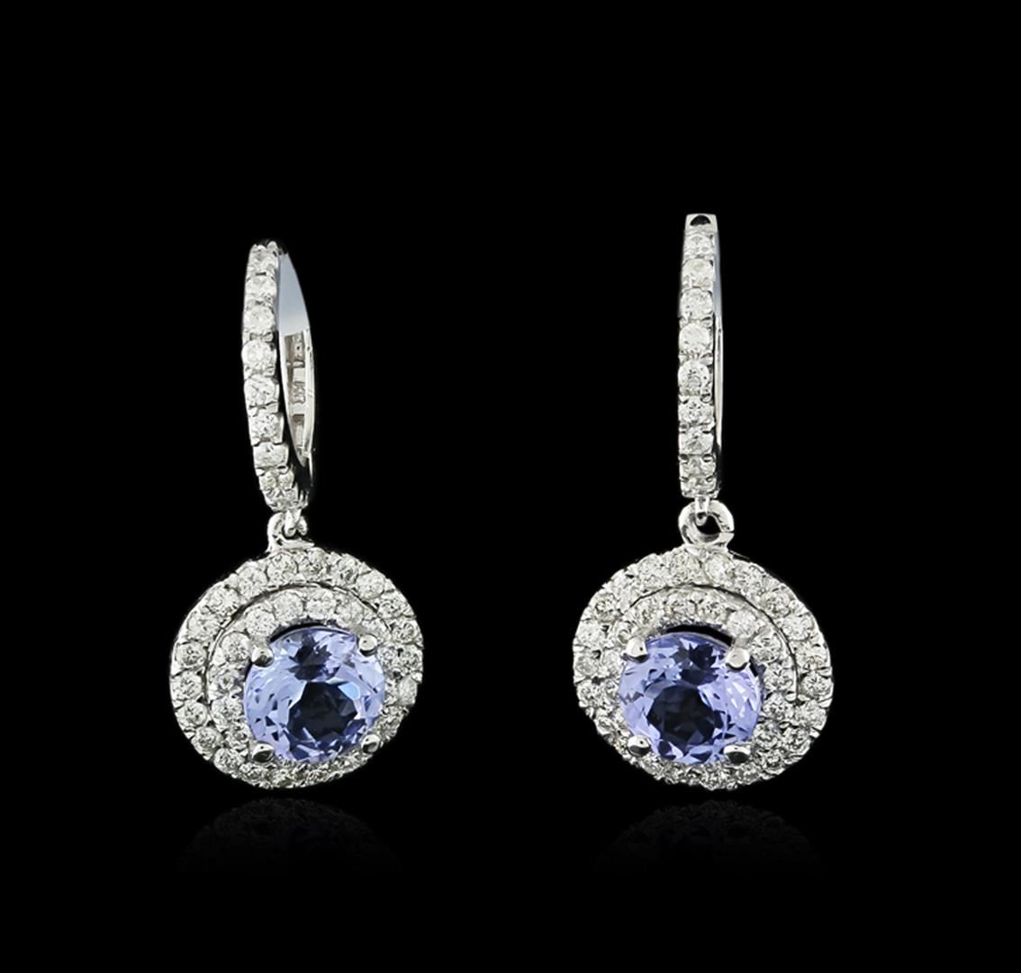 One pair electronically tested 14KT white gold ladies cast tanzanite and diamond earrings with hinged clip backs with a bright polish finish. Identified with markings of "14K". Condition is new. Containing: Two prong set round modified brilliant cut natural tanzanites, measuring 6.90 - 6.90 x 4.49 mm, approximate total weight of 2.83ct., clarity is eye clean, type I, medium light, very slightly grayish, violet color, (GIA V 4/3), cut is good. Ninety-Eight prong set round brilliant cut diamonds, measuring 1.40 - 1.40 x 0.84mm (depth est.) approximate total weight of 98 Stones = 1.30ct. Clarity: SI-1 to SI-2. Color: I - J, Cut is Good. Colored gemstones are presumed to have been subjected to commonly used enhancement processes. All diamonds and colored gemstones are graded in the mounting, unless otherwise stated. Total Weight of Colored Stones 2.83ct. Total Weight of Diamonds 1.30ct. Total Weight of Earrings 6.50 grams. GGL Appraised at $4,650.00.