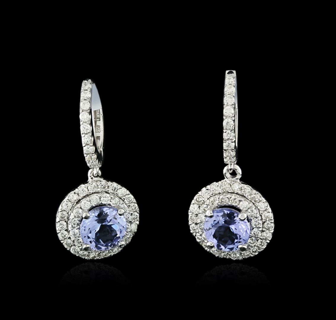 One pair electronically tested 14KT white gold ladies cast tanzanite and diamond earrings with hinged clip backs with a bright polish finish. Identified with markings of "14K". Condition is new. Containing: Two prong set round modified brilliant cut natural tanzanites, measuring 6.90 - 6.90 x 4.49 mm, approximate total weight of 2.83ct., clarity is eye clean, type I, medium light, very slightly grayish, violet color, (GIA V 4/3), cut is good. Ninety-Eight prong set round brilliant cut diamonds, measuring 1.40 - 1.40 x 0.84mm (depth est.) approximate total weight of 98 Stones = 1.30ct. Clarity: SI-1 to SI-2. Color: I - J, Cut is Good. Colored gemstones are presumed to have been subjected to commonly used enhancement processes. All diamonds and colored gemstones are graded in the mounting, unless otherwise stated. Total Weight of Colored Stones 2.83ct. Total Weight of Diamonds 1.30ct. Total Weight of Earrings 6.50 grams. GGL Appraised at $4,650.00.