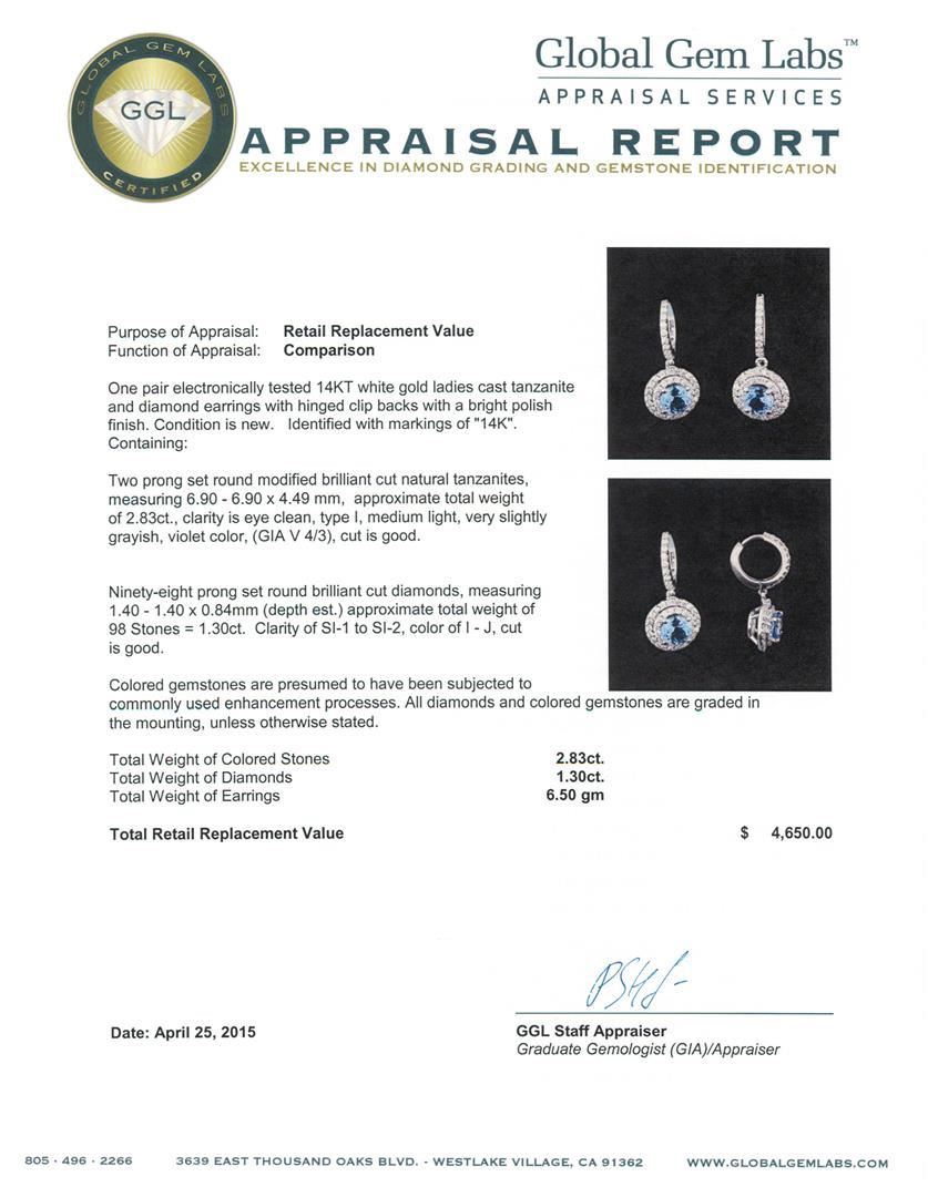 One pair electronically tested 14KT white gold ladies cast tanzanite and diamond earrings with hinged clip backs with a bright polish finish. Identified with markings of "14K". Condition is new. Containing: Two prong set round modified brilliant cut natural tanzanites, measuring 6.90 - 6.90 x 4.49 mm, approximate total weight of 2.83ct., clarity is eye clean, type I, medium light, very slightly grayish, violet color, (GIA V 4/3), cut is good. Ninety-Eight prong set round brilliant cut diamonds, measuring 1.40 - 1.40 x 0.84mm (depth est.) approximate total weight of 98 Stones = 1.30ct. Clarity: SI-1 to SI-2. Color: I - J, Cut is Good. Colored gemstones are presumed to have been subjected to commonly used enhancement processes. All diamonds and colored gemstones are graded in the mounting, unless otherwise stated. Total Weight of Colored Stones 2.83ct. Total Weight of Diamonds 1.30ct. Total Weight of Earrings 6.50 grams. GGL Appraised at $4,650.00.