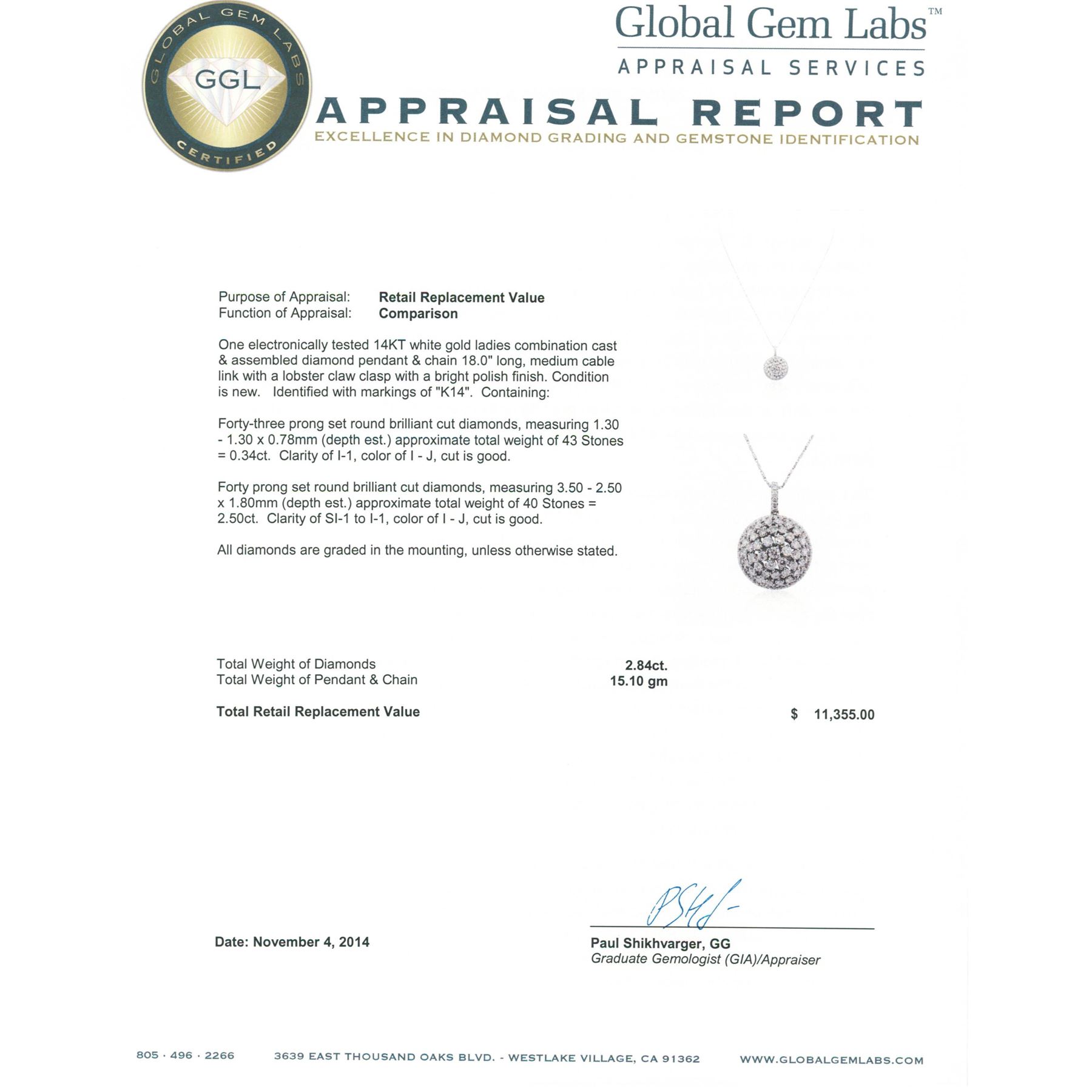 One electronically tested 14KT white gold ladies combination cast & assembled diamond pendant & chain 18.0" long, medium cable link with a lobster claw clasp with a bright polish finish. Identified with markings of "K14". Condition is new. Containing: Forty-Three prong set round brilliant cut diamonds, measuring 1.30 - 1.30 x 0.78mm (depth est.) approximate total weight of 43 Stones = 0.34ct. Clarity: I-1. Color: I - J, Cut is Good. Forty prong set round brilliant cut diamonds, measuring 3.50 - 2.50 x 1.80mm (depth est.) approximate total weight of 40 Stones = 2.50 ct. Clarity: SI-1 to I-1. Color: I - J, Cut is Good. All diamonds are graded in the mounting, unless otherwise stated. Total Weight of Diamonds 2.84ct. Total Weight of Pendant & Chain 15.10 grams. GGL Appraised.