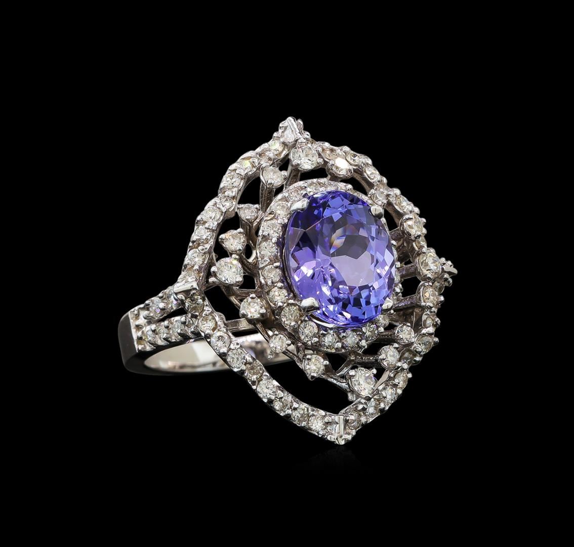 One electronically tested 14KT white gold ladies cast tanzanite and diamond ring with a split shoulder shank with a bright polish finish. Identified with markings of "K14". Condition is new. Containing: One prong set oval modified brilliant cut natural tanzanite, measuring 9.70 x 8.00 x 5.20mm, approximate weight of 2.84ct., clarity is eye clean, type I, light, moderately strong, violet color, (GIA V 3/4), cut is good. Seventy-Six prong set round brilliant cut diamonds, measuring 1.30 - 1.30 x 0.78mm (depth est.) approximate total weight of 76 Stones = 0.61ct. Clarity of SI-1 to I-1, Color of I - J, Cut is Good. Sixteen prong set round brilliant cut diamonds, measuring 1.70 - 1.50 x 0.96mm (depth est.) approximate total weight of 16 Stones = 0.24ct. Clarity of SI-2 to I-1, Color of I - J. All diamonds and colored gemstones are graded in the mounting, unless otherwise stated. Colored gemstones are presumed to have been subjected to commonly used enhancement processes. Total Weight of Colored Stones 2.84ct. Total Weight of Diamonds 0.85ct. Total Weight of Ring 6.70 grams. GGL Appraised at $4,880.00.