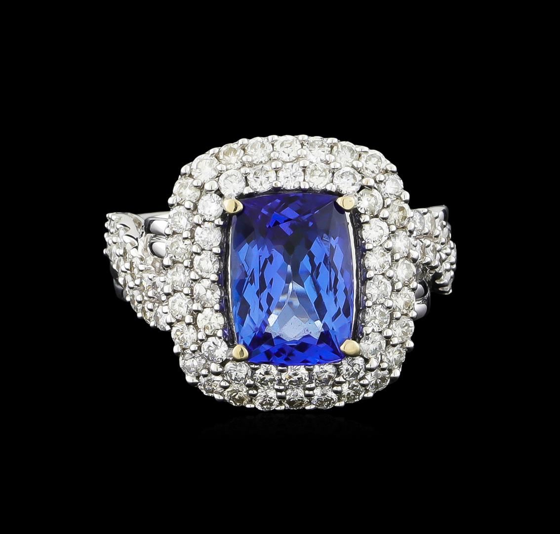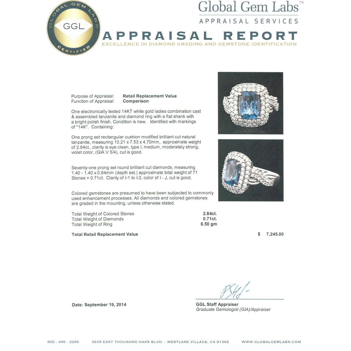 One electronically tested 14KT white gold ladies combination cast & assembled tanzanite and diamond ring with a flat shank with a bright polish finish. Identified with markings of "14K". Condition is new. Containing: One prong set rectangular cushion modified brilliant cut natural tanzanite, measuring 10.21 x 7.53 x 4.70mm, approximate weight of 2.84ct., clarity is eye clean, type I, medium, moderately strong, violet color, (GIA V 5/4), cut is good. Seventy-One prong set round brilliant cut diamonds, measuring 1.40 - 1.40 x 0.84mm (depth est.) approximate total weight of 71 Stones = 0.71ct. Clarity: I-1 to I-2. Color: I - J, Cut is Good. Colored gemstones are presumed to have been subjected to commonly used enhancement processes. All diamonds and colored gemstones are graded in the mounting, unless otherwise stated. Total Weight of Colored Stones 2.84ct. Total Weight of Diamonds 0.71ct. Total Weight of Ring 6.50 grams. GGL Appraised at $7,245.00.