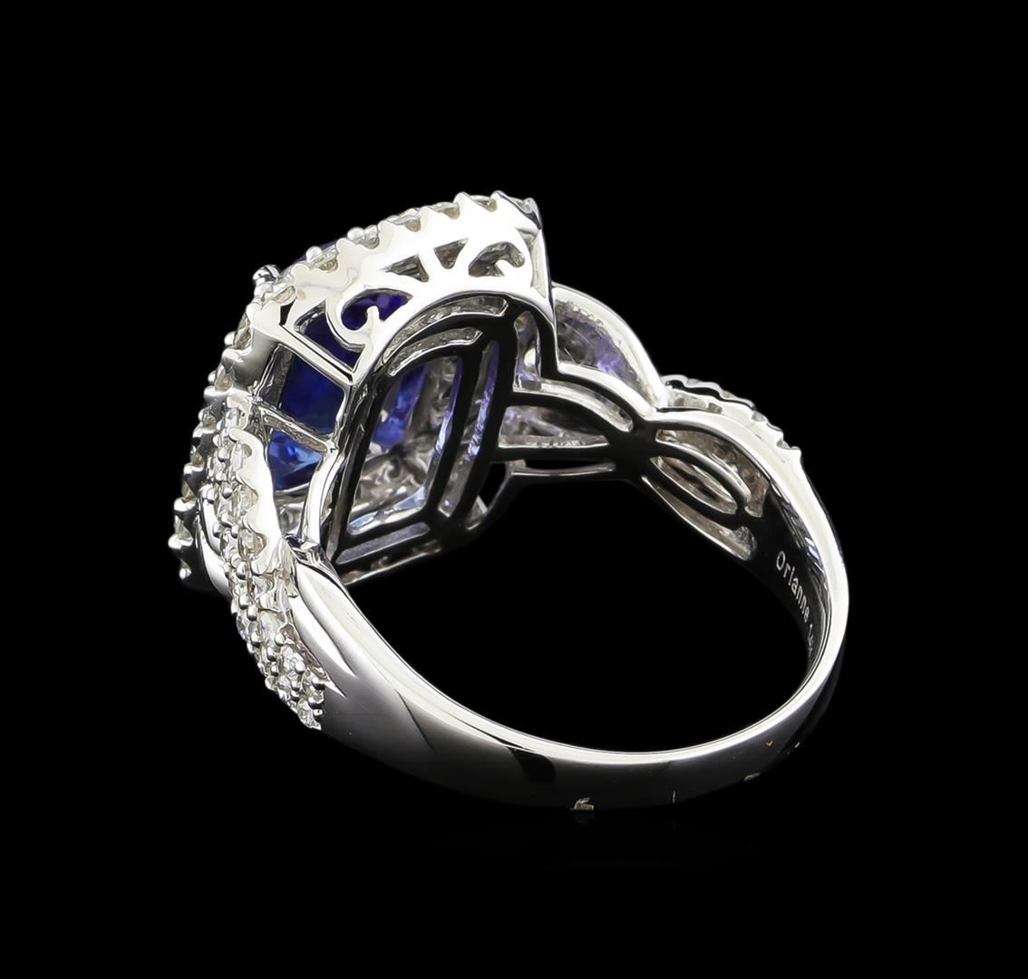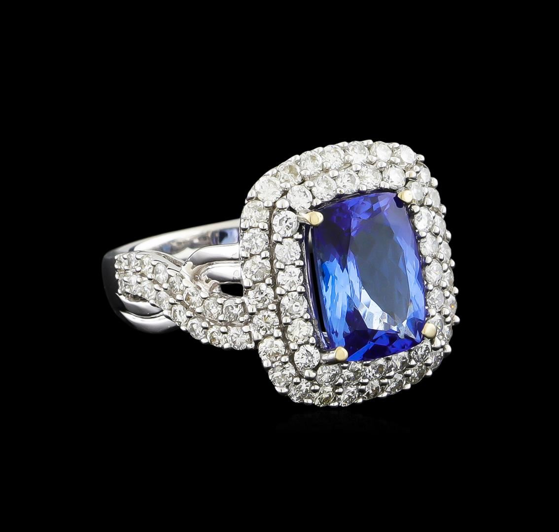 One electronically tested 14KT white gold ladies combination cast & assembled tanzanite and diamond ring with a flat shank with a bright polish finish. Identified with markings of "14K". Condition is new. Containing: One prong set rectangular cushion modified brilliant cut natural tanzanite, measuring 10.21 x 7.53 x 4.70mm, approximate weight of 2.84ct., clarity is eye clean, type I, medium, moderately strong, violet color, (GIA V 5/4), cut is good. Seventy-One prong set round brilliant cut diamonds, measuring 1.40 - 1.40 x 0.84mm (depth est.) approximate total weight of 71 Stones = 0.71ct. Clarity: I-1 to I-2. Color: I - J, Cut is Good. Colored gemstones are presumed to have been subjected to commonly used enhancement processes. All diamonds and colored gemstones are graded in the mounting, unless otherwise stated. Total Weight of Colored Stones 2.84ct. Total Weight of Diamonds 0.71ct. Total Weight of Ring 6.50 grams. GGL Appraised at $7,245.00.
