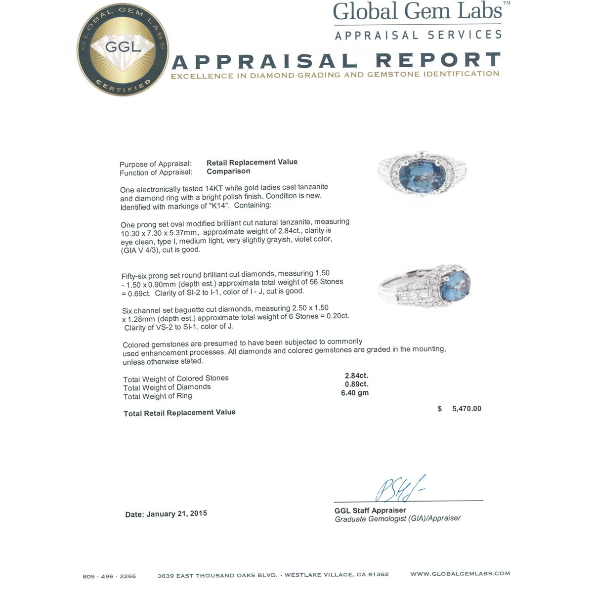 One electronically tested 14KT white gold ladies cast tanzanite and diamond ring with a bright polish finish. Identified with markings of "K14". Condition is new. Containing: One prong set oval modified brilliant cut natural tanzanite, measuring 10.30 x 7.30 x 5.37mm, approximate weight of 2.84ct., clarity is eye clean, type I, medium light, very slightly grayish, violet color, (GIA V 4/3), cut is good. Fifty-Six prong set round brilliant cut diamonds, measuring 1.50 - 1.50 x 0.90mm (depth est.) approximate total weight of 56 Stones = 0.69ct. Clarity: SI-2 to I-1. Color: I - J, Cut is Good. Six channel set baguette cut diamonds, measuring 2.50 x 1.50 x 1.28mm (depth est.) approximate total weight of 6 Stones = 0.20ct. Clarity: VS-2 to SI-1. Color: J. Colored gemstones are presumed to have been subjected to commonly used enhancement processes. All diamonds and colored gemstones are graded in the mounting, unless otherwise stated. Total Weight of Colored Stones 2.84ct. Total Weight of Diamonds 0.89ct. Total Weight of Ring 6.40 grams. GGL Appraised at $5,470.00.
