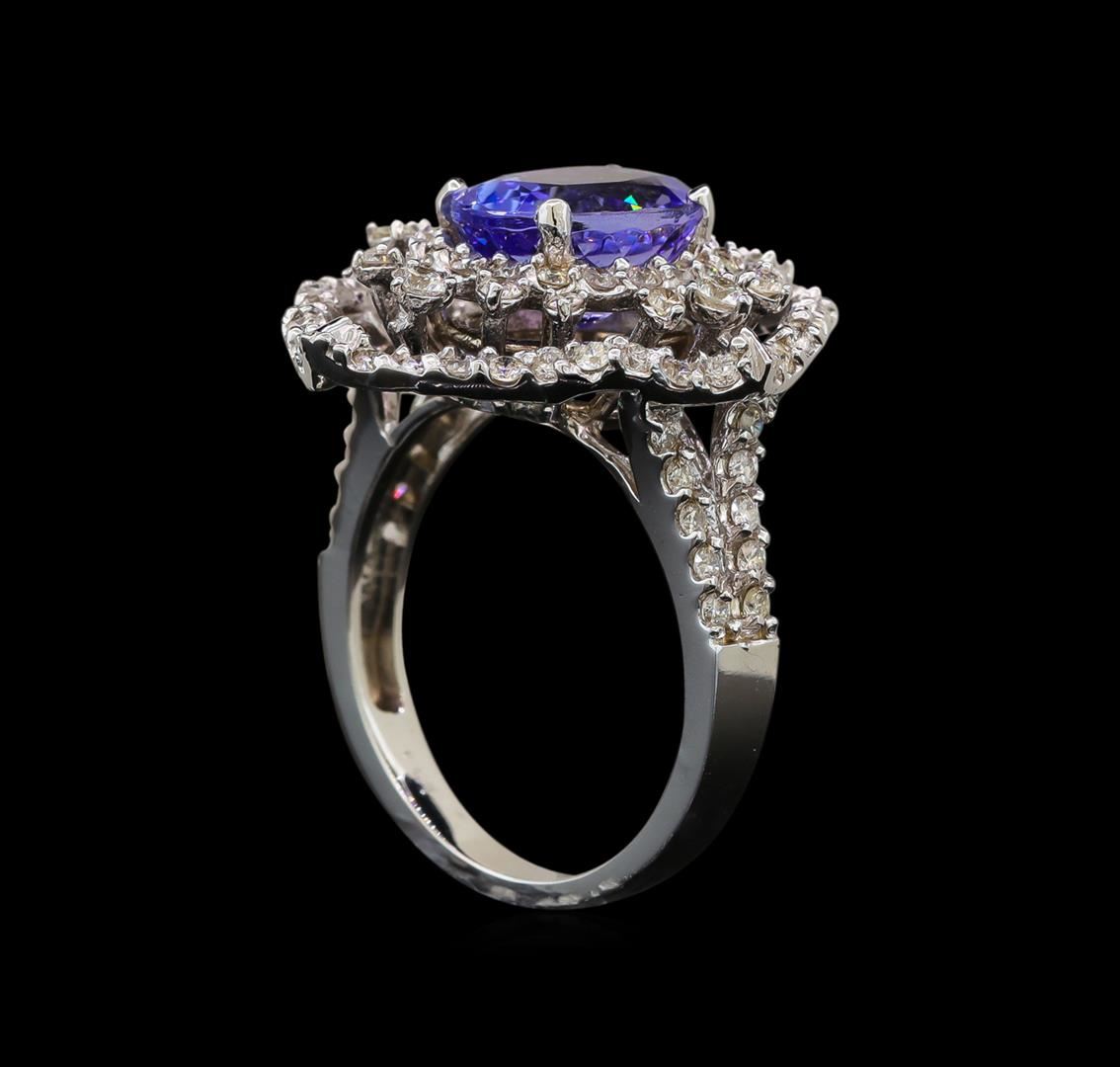 One electronically tested 14KT white gold ladies cast tanzanite and diamond ring with a split shoulder shank with a bright polish finish. Identified with markings of "K14". Condition is new. Containing: One prong set oval modified brilliant cut natural tanzanite, measuring 9.70 x 8.00 x 5.20mm, approximate weight of 2.84ct., clarity is eye clean, type I, light, moderately strong, violet color, (GIA V 3/4), cut is good. Seventy-Six prong set round brilliant cut diamonds, measuring 1.30 - 1.30 x 0.78mm (depth est.) approximate total weight of 76 Stones = 0.61ct. Clarity of SI-1 to I-1, Color of I - J, Cut is Good. Sixteen prong set round brilliant cut diamonds, measuring 1.70 - 1.50 x 0.96mm (depth est.) approximate total weight of 16 Stones = 0.24ct. Clarity of SI-2 to I-1, Color of I - J. All diamonds and colored gemstones are graded in the mounting, unless otherwise stated. Colored gemstones are presumed to have been subjected to commonly used enhancement processes. Total Weight of Colored Stones 2.84ct. Total Weight of Diamonds 0.85ct. Total Weight of Ring 6.70 grams. GGL Appraised at $4,880.00.