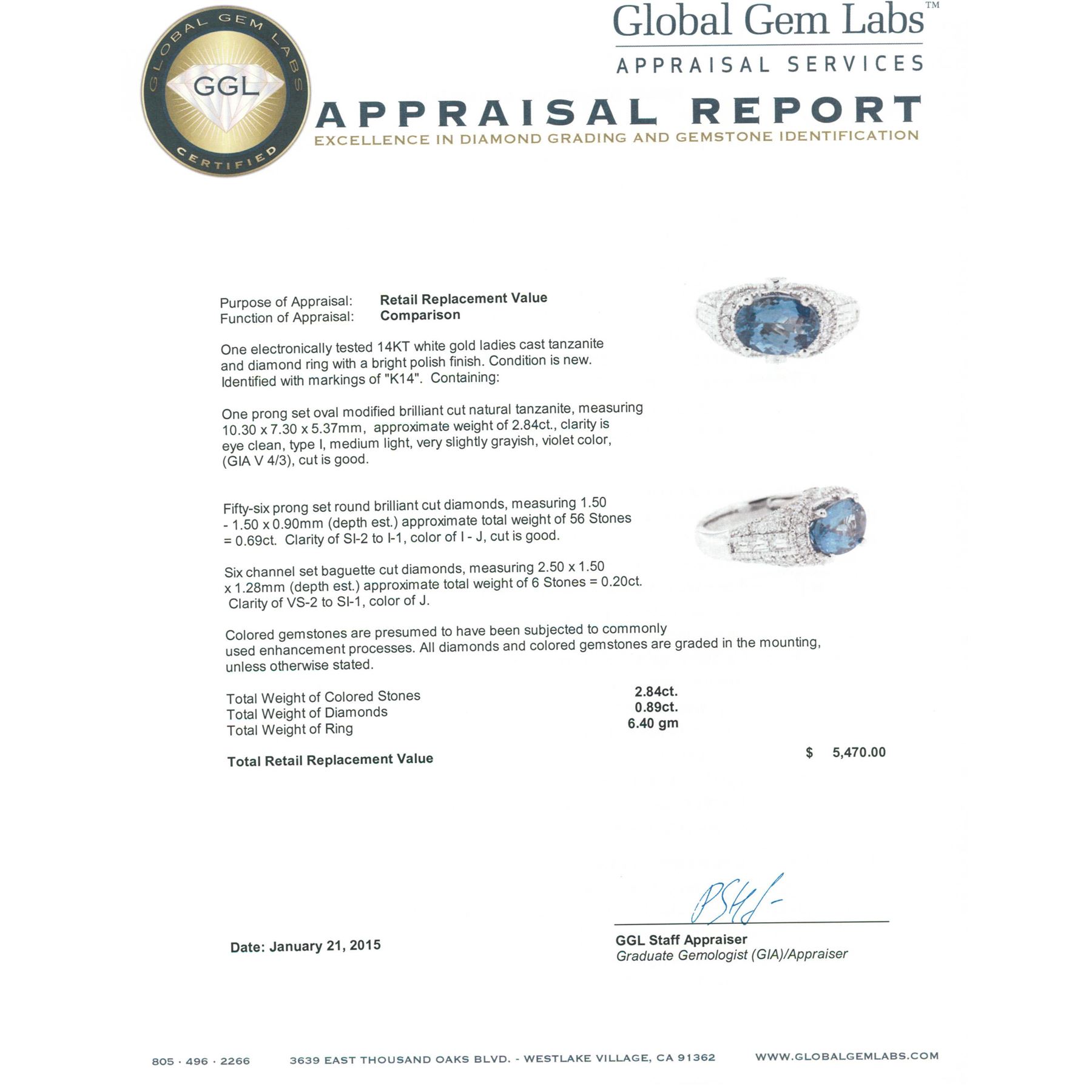 One electronically tested 14KT white gold ladies cast tanzanite and diamond ring with a bright polish finish. Identified with markings of "K14". Condition is new. Containing: One prong set oval modified brilliant cut natural tanzanite, measuring 10.30 x 7.30 x 5.37mm, approximate weight of 2.84ct., clarity is eye clean, type I, medium light, very slightly grayish, violet color, (GIA V 4/3), cut is good. Fifty-Six prong set round brilliant cut diamonds, measuring 1.50 - 1.50 x 0.90mm (depth est.) approximate total weight of 56 Stones = 0.69ct. Clarity: SI-2 to I-1. Color: I - J, Cut is Good. Six channel set baguette cut diamonds, measuring 2.50 x 1.50 x 1.28mm (depth est.) approximate total weight of 6 Stones = 0.20 ct. Clarity: VS-2 to SI-1. Color: J. Colored gemstones are presumed to have been subjected to commonly used enhancement processes. All diamonds and colored gemstones are graded in the mounting, unless otherwise stated. Total Weight of Colored Stones 2.84ct. Total Weight of Diamonds 0.89ct. Total Weight of Ring 6.40 grams. GGL Appraised.