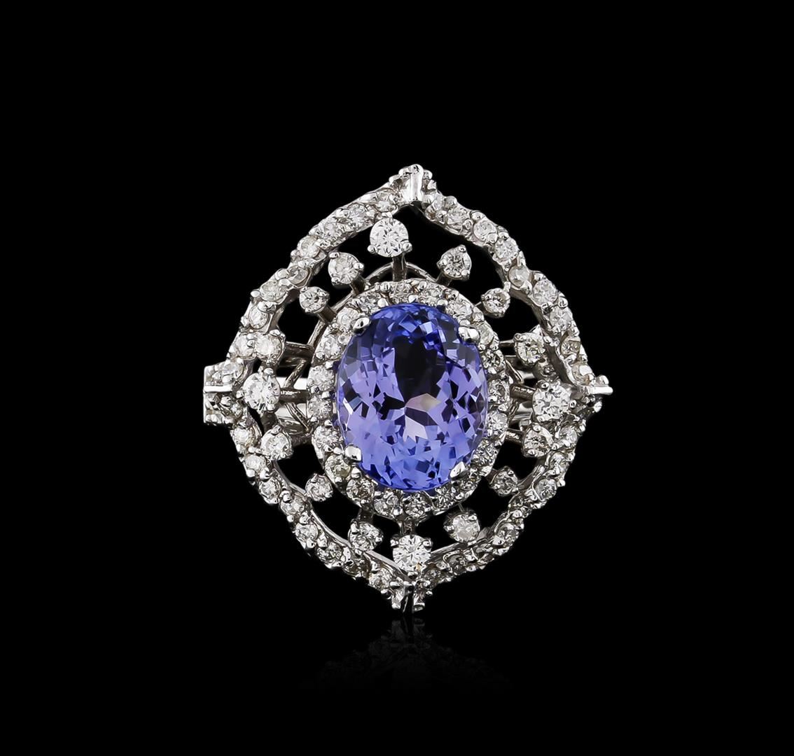 One electronically tested 14KT white gold ladies cast tanzanite and diamond ring with a split shoulder shank with a bright polish finish. Identified with markings of "K14". Condition is new. Containing: One prong set oval modified brilliant cut natural tanzanite, measuring 9.70 x 8.00 x 5.20mm, approximate weight of 2.84ct., clarity is eye clean, type I, light, moderately strong, violet color, (GIA V 3/4), cut is good. Seventy-Six prong set round brilliant cut diamonds, measuring 1.30 - 1.30 x 0.78mm (depth est.) approximate total weight of 76 Stones = 0.61ct. Clarity of SI-1 to I-1, Color of I - J, Cut is Good. Sixteen prong set round brilliant cut diamonds, measuring 1.70 - 1.50 x 0.96mm (depth est.) approximate total weight of 16 Stones = 0.24ct. Clarity of SI-2 to I-1, Color of I - J. All diamonds and colored gemstones are graded in the mounting, unless otherwise stated. Colored gemstones are presumed to have been subjected to commonly used enhancement processes. Total Weight of Colored Stones 2.84ct. Total Weight of Diamonds 0.85ct. Total Weight of Ring 6.70 grams. GGL Appraised at $4,880.00.