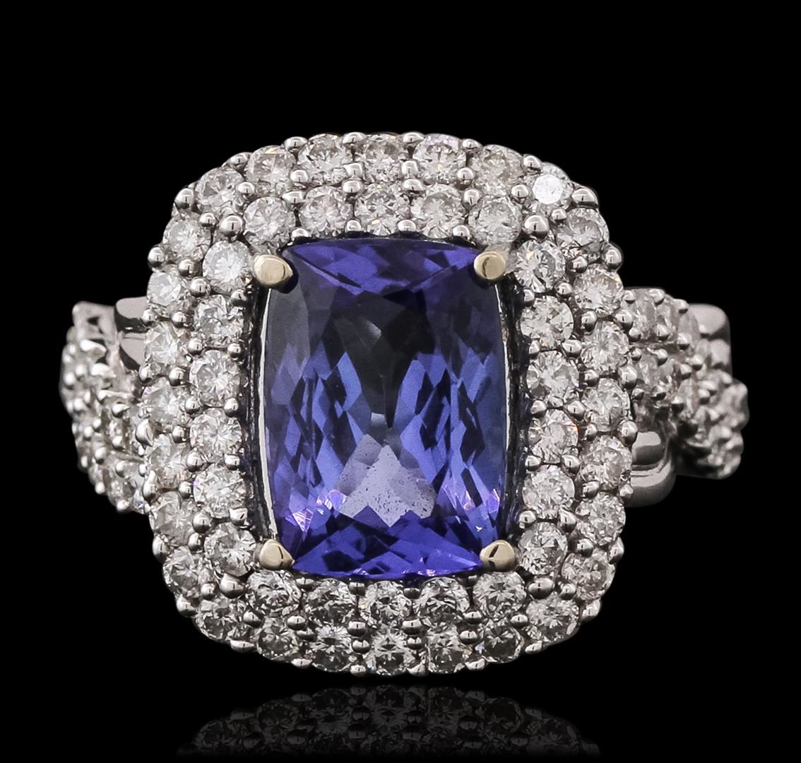 One electronically tested 14KT white gold ladies combination cast & assembled tanzanite and diamond ring with a flat shank with a bright polish finish. Identified with markings of "14K". Condition is new. Containing: One prong set rectangular cushion modified brilliant cut natural tanzanite, measuring 10.21 x 7.53 x 4.70mm, approximate weight of 2.84ct., clarity is eye clean, type I, medium, moderately strong, violet color, (GIA V 5/4), cut is good. Seventy-One prong set round brilliant cut diamonds, measuring 1.40 - 1.40 x 0.84mm (depth est.) approximate total weight of 71 Stones = 0.71ct. Clarity: I-1 to I-2. Color: I - J, Cut is Good. Colored gemstones are presumed to have been subjected to commonly used enhancement processes. All diamonds and colored gemstones are graded in the mounting, unless otherwise stated. Total Weight of Colored Stones 2.84ct. Total Weight of Diamonds 0.71ct. Total Weight of Ring 6.50 grams. GGL Appraised at $7,245.00.