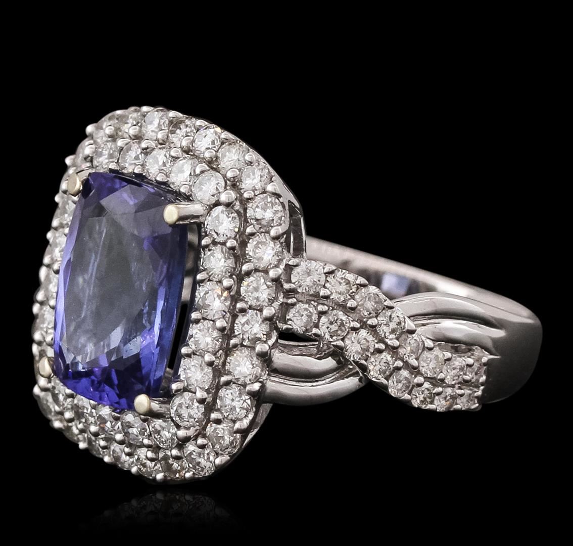 One electronically tested 14KT white gold ladies combination cast & assembled tanzanite and diamond ring with a flat shank with a bright polish finish. Identified with markings of "14K". Condition is new. Containing: One prong set rectangular cushion modified brilliant cut natural tanzanite, measuring 10.21 x 7.53 x 4.70mm, approximate weight of 2.84ct., clarity is eye clean, type I, medium, moderately strong, violet color, (GIA V 5/4), cut is good. Seventy-One prong set round brilliant cut diamonds, measuring 1.40 - 1.40 x 0.84mm (depth est.) approximate total weight of 71 Stones = 0.71ct. Clarity: I-1 to I-2. Color: I - J, Cut is Good. Colored gemstones are presumed to have been subjected to commonly used enhancement processes. All diamonds and colored gemstones are graded in the mounting, unless otherwise stated. Total Weight of Colored Stones 2.84ct. Total Weight of Diamonds 0.71ct. Total Weight of Ring 6.50 grams. GGL Appraised at $7,245.00.