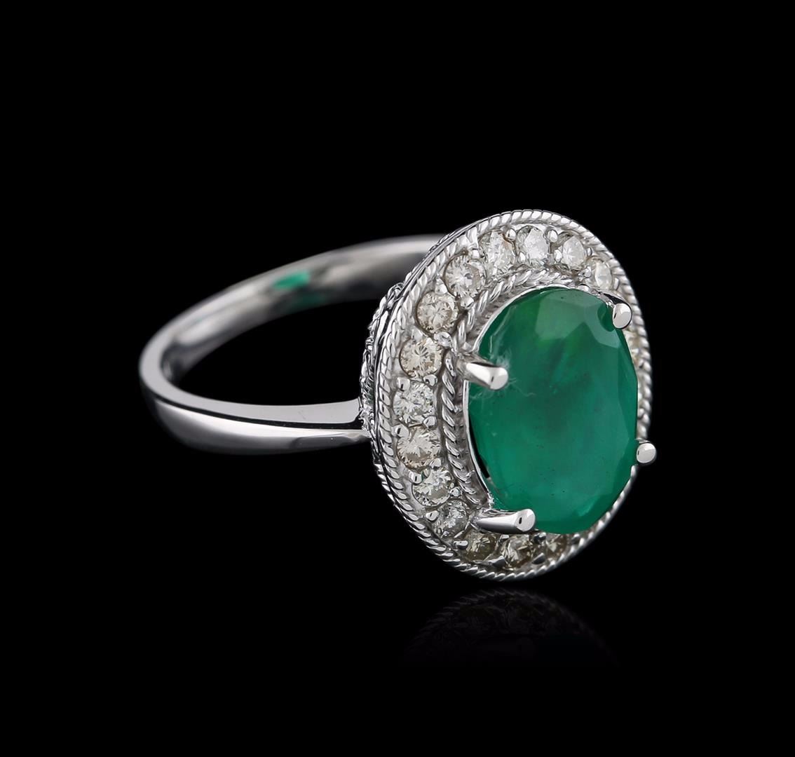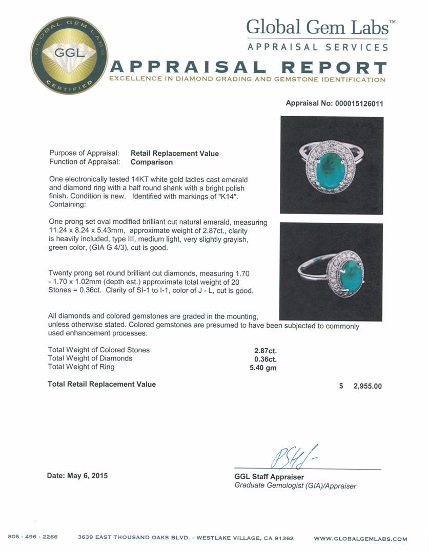 One electronically tested 14KT white gold ladies cast emerald and diamond ring with a half round shank with a bright polish finish. Identified with markings of "K14". Condition is new. Containing: One prong set oval modified brilliant cut natural emerald, measuring 11.24 x 8.24 x 5.43mm, approximate weight of 2.87ct., clarity is heavily included, type III, medium light, very slightly grayish, green color, (GIA G 4/3), cut is good. Twenty prong set round brilliant cut diamonds, measuring 1.70 - 1.70 x 1.02mm (depth est.) approximate total weight of 20 Stones = 0.36ct. Clarity: SI-1 to I-1. Color: J - L, Cut is Good. All diamonds and colored gemstones are graded in the mounting, unless otherwise stated. Colored gemstones are presumed to have been subjected to commonly used enhancement processes.. Total Weight of Colored Stones 2.87ct. Total Weight of Diamonds 0.36ct. Total Weight of Ring 5.40 grams. GGL Appraised at $2,955.00.