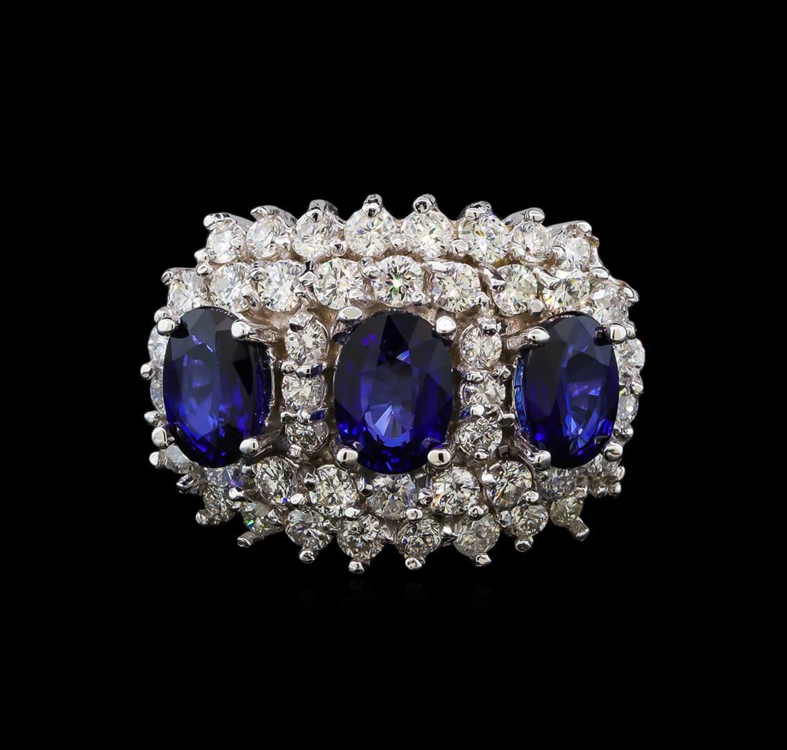 One electronically tested 14KT white gold ladies cast sapphire and diamond ring with a bright polish finish. Identified with markings of "14K". Condition is new. Containing: Three prong set oval modified brilliant cut natural blue sapphires, measuring 7.00. x 5.00. x 3.25mm, approximate total weight of 2.88ct., clarity is eye clean, type II, medium light, very slightly grayish, blue color, (GIA B 4/3), cut is good. Thirty-Seven prong set round brilliant cut diamonds, measuring 2.10 - 1.50 x 1.08mm (depth est.) approximate total weight of 37 Stones = 0.79ct. Clarity: SI-2 to I-1. Color: G - H, Cut is Good. Colored gemstones are presumed to have been subjected to commonly used enhancement processes. All diamonds and colored gemstones are graded in the mounting, unless otherwise stated. Total Weight of Colored Stones 2.88ct. Total Weight of Diamonds 0.79ct. Total Weight of Ring 9.60 grams. GGL Appraised at $4,500.00.
