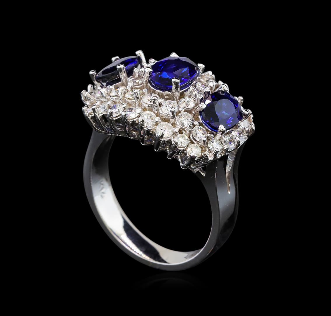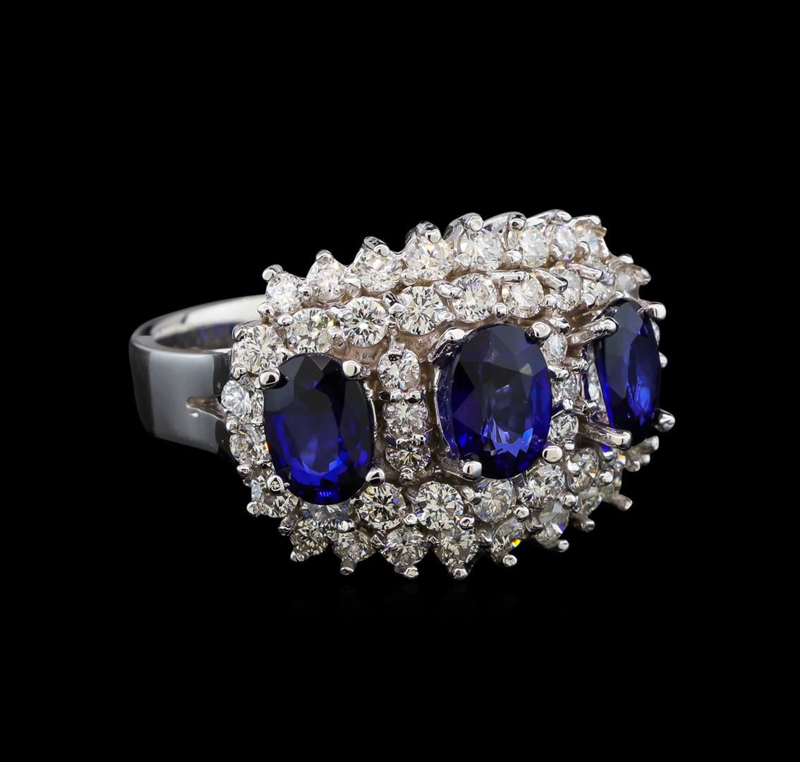 One electronically tested 14KT white gold ladies cast sapphire and diamond ring with a bright polish finish. Identified with markings of "14K". Condition is new. Containing: Three prong set oval modified brilliant cut natural blue sapphires, measuring 7.00. x 5.00. x 3.25mm, approximate total weight of 2.88ct., clarity is eye clean, type II, medium light, very slightly grayish, blue color, (GIA B 4/3), cut is good. Thirty-Seven prong set round brilliant cut diamonds, measuring 2.10 - 1.50 x 1.08mm (depth est.) approximate total weight of 37 Stones = 0.79ct. Clarity: SI-2 to I-1. Color: G - H, Cut is Good. Colored gemstones are presumed to have been subjected to commonly used enhancement processes. All diamonds and colored gemstones are graded in the mounting, unless otherwise stated. Total Weight of Colored Stones 2.88ct. Total Weight of Diamonds 0.79ct. Total Weight of Ring 9.60 grams. GGL Appraised at $4,500.00.