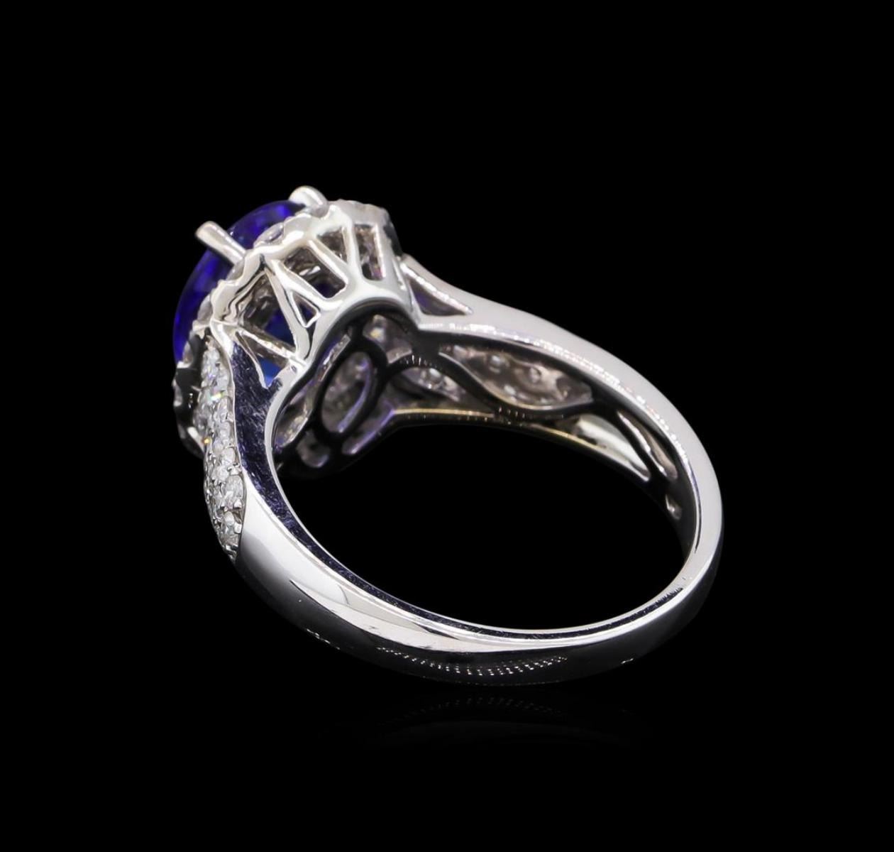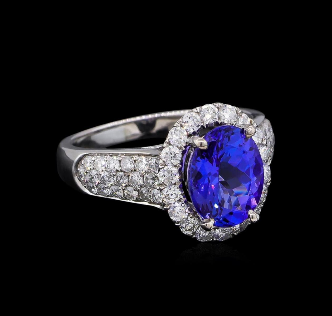 One electronically tested 14KT white gold Ladies combination cast & assembled ring with a bright polish finish. Condition is new. Identified with markings of "14K". Containing: Fifty-Four bead set round brilliant cut diamonds, measuring 1.70 - 1.70 x 1.02mm (depth est.) approximate. Total Weight of 54 Stones = 1.24ct. Clarity: I-1 to I-2. Color: H - I, Cut is Good. One prong set oval modified brilliant cut natural tanzanite, measuring 10.00 x 7.80 x 5.40mm, exact weight 2.88ct., clarity is eye clean, type I, medium light, very slightly grayish, violet color, (GIA V 4/3), cut is very good. Colored gemstones are presumed to have been subjected to commonly used color/clarity enhancement processes. Total Weight of Colored Stones 2.88ct. Total Weight of Diamonds 1.24ct. Total Weight of Ring 5.90 grams. GGL Appraised.