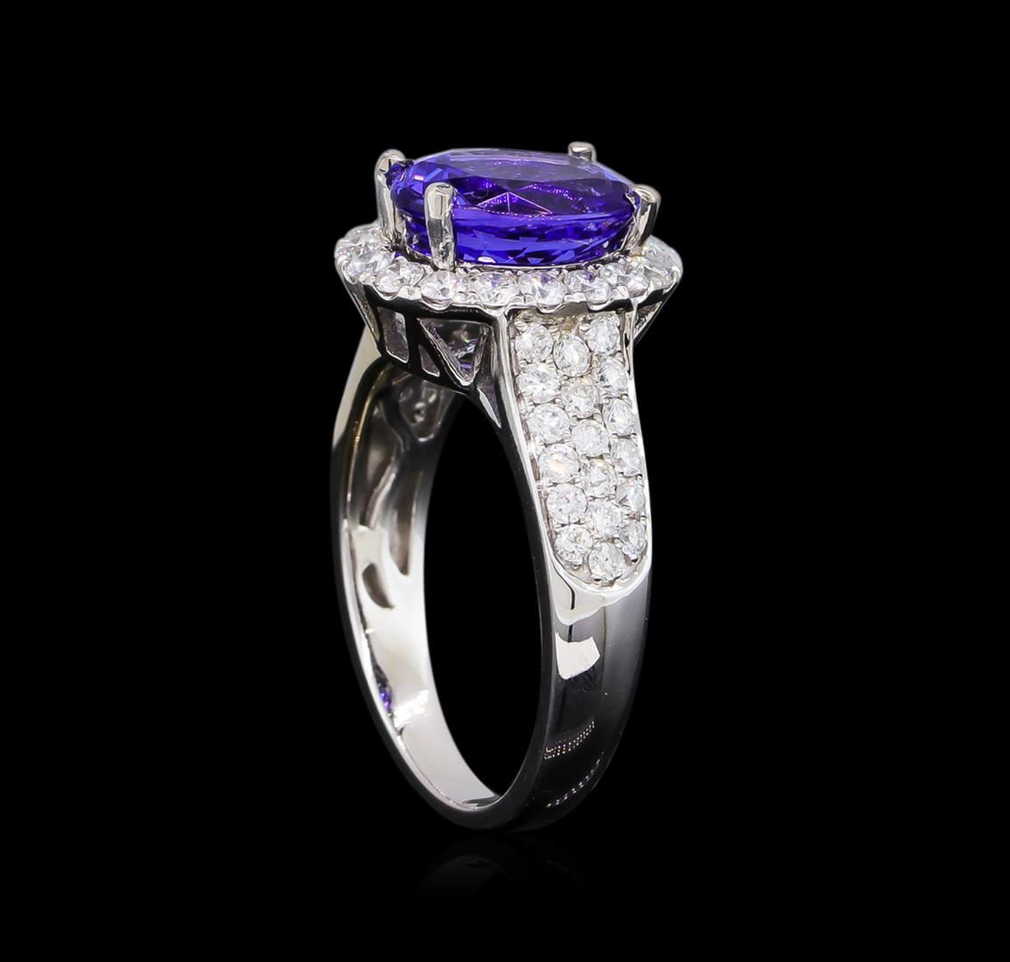 One electronically tested 14KT white gold Ladies combination cast & assembled ring with a bright polish finish. Condition is new. Identified with markings of "14K". Containing: Fifty-Four bead set round brilliant cut diamonds, measuring 1.70 - 1.70 x 1.02mm (depth est.) approximate. Total Weight of 54 Stones = 1.24ct. Clarity: I-1 to I-2. Color: H - I, Cut is Good. One prong set oval modified brilliant cut natural tanzanite, measuring 10.00 x 7.80 x 5.40mm, exact weight 2.88ct., clarity is eye clean, type I, medium light, very slightly grayish, violet color, (GIA V 4/3), cut is very good. Colored gemstones are presumed to have been subjected to commonly used color/clarity enhancement processes. Total Weight of Colored Stones 2.88ct. Total Weight of Diamonds 1.24ct. Total Weight of Ring 5.90 grams. GGL Appraised.