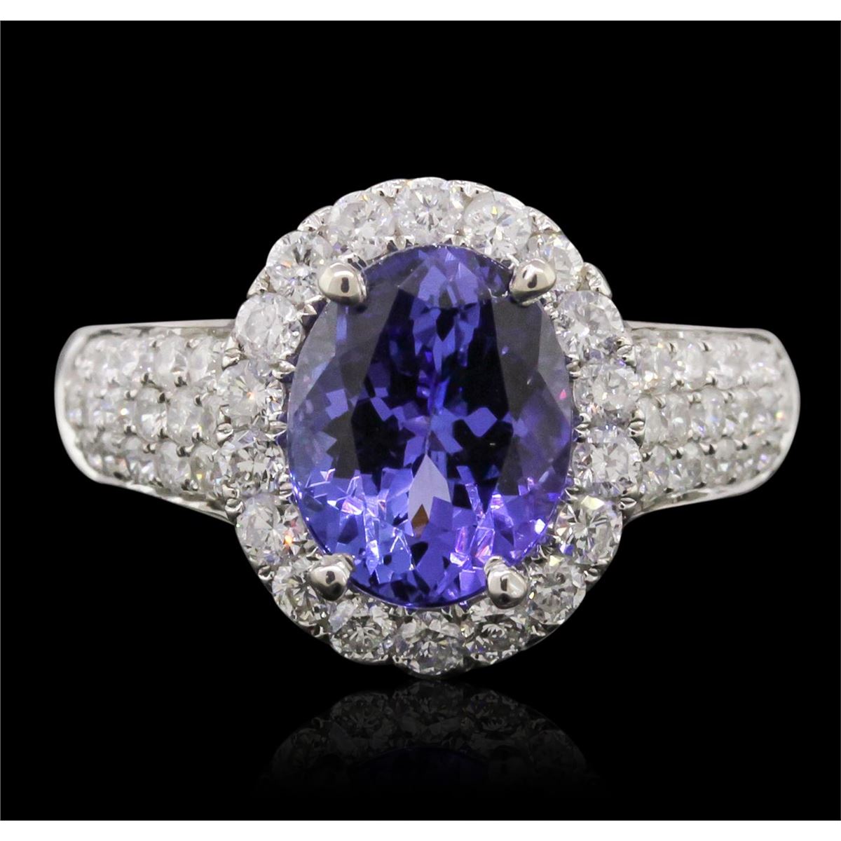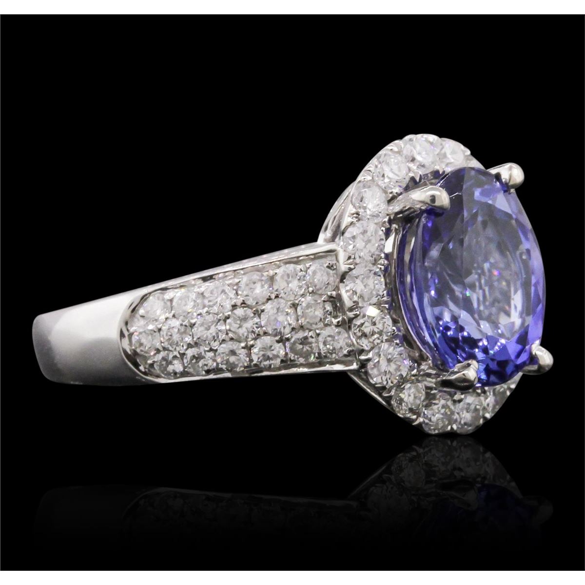 One electronically tested 14KT white gold Ladies combination cast & assembled ring with a bright polish finish. Condition is new. Identified with markings of "14K". Containing: Fifty-Four bead set round brilliant cut diamonds, measuring 1.70 - 1.70 x 1.02mm (depth est.) approximate. Total Weight of 54 Stones = 1.24ct. Clarity: I-1 to I-2. Color: H - I, Cut is Good. One prong set oval modified brilliant cut natural tanzanite, measuring 10.00 x 7.80 x 5.40mm, exact weight 2.88ct., clarity is eye clean, type I, medium light, very slightly grayish, violet color, (GIA V 4/3), cut is very good. Colored gemstones are presumed to have been subjected to commonly used color/clarity enhancement processes. Total Weight of Colored Stones 2.88ct. Total Weight of Diamonds 1.24ct. Total Weight of Ring 5.90 grams. GGL Appraised at $8,570.00.