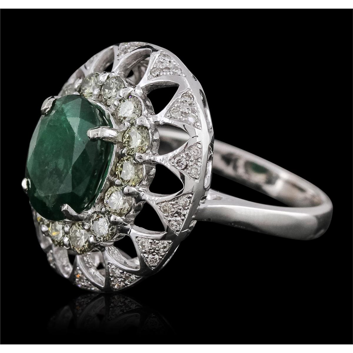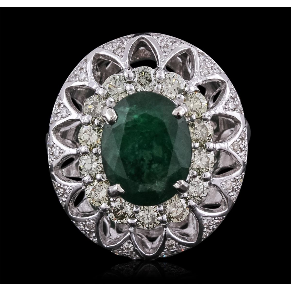 One electronically tested 14KT white gold ladies cast emerald and diamond ring with a bright polish finish. Condition is new, good workmanship. The featured emerald is set within stylized tiered diamond bezels, completed by a two and one-half millimeter wide band. Identified with markings of "K14". Containing: One prong set oval mixed cut natural emerald, measuring 10.70 x 8.40 x 5.40mm, 8%. bulge factor, approximate weight of 2.89ct., clarity is heavily included, type III, dark, very slightly grayish, very slightly bluish green color, (GIA vslbG 7/3), cut is good. Transmitting light somewhat diffusely, transparent to translucent. Indications of oil & opticon residue. Graded in the setting. Fourteen prong set round brilliant cut diamonds, measuring 2.60 - 2.50 x 1.53mm (depth est.) approximate. Total Weight of 14 Stones = 0.94ct. Color grade is an average for the group. Graded in the setting. Clarity: SI-1 to I-1 Forty-Two bead set round brilliant cut diamonds, measuring 1.10 - 1.00 x 0.63mm (depth est.) approximate. Total Weight of 42 Stones = 0.27ct. Graded in the setting. Clarity: VS-1 to SI-1. Color: I - K. Total Weight of Colored Stones 2.89ct. Total Weight of Diamonds 1.21ct. Total Weight of Ring 8.06 grams. AIG Appraised at $6,500.00.
