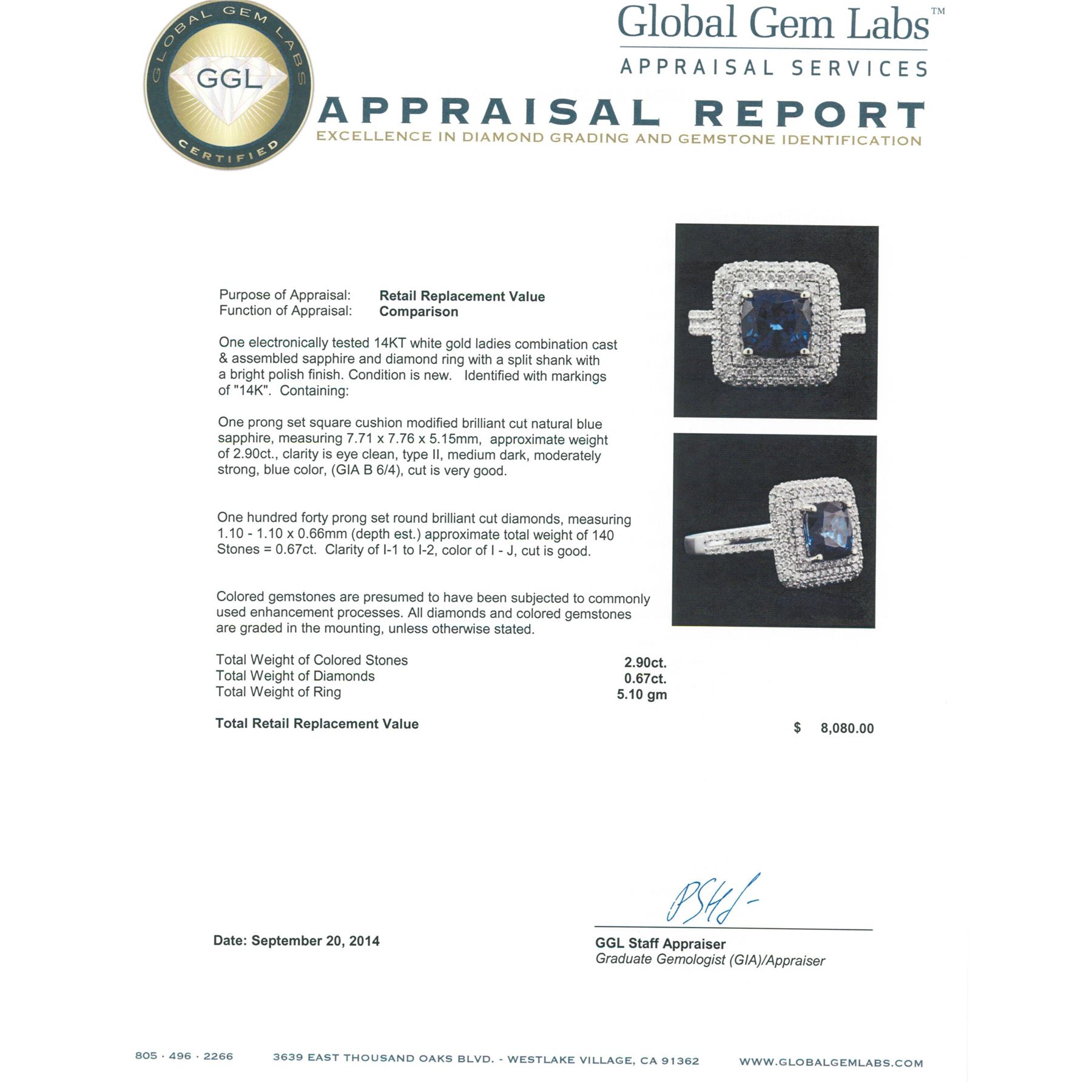 One electronically tested 14KT white gold ladies combination cast & assembled sapphire and diamond ring with a split shank with a bright polish finish. Identified with markings of "14K". Condition is new. Containing: One prong set square cushion modified brilliant cut natural blue sapphire, measuring 7.71 x 7.76 x 5.15mm, approximate weight of 2.90ct., clarity is eye clean, type II, medium dark, moderately strong, blue color, (GIA B 6/4), cut is very good. One Hundred Forty prong set round brilliant cut diamonds, measuring 1.10 - 1.10 x 0.66mm (depth est.) approximate total weight of 140 Stones = 0.67ct. Clarity: I-1 to I-2. Color: I - J, Cut is Good. Colored gemstones are presumed to have been subjected to commonly used enhancement processes. All diamonds and colored gemstones are graded in the mounting, unless otherwise stated. Total Weight of Colored Stones 2.90ct. Total Weight of Diamonds 0.67ct. Total Weight of Ring 5.10 grams. GGL Appraised at $8,080.00.