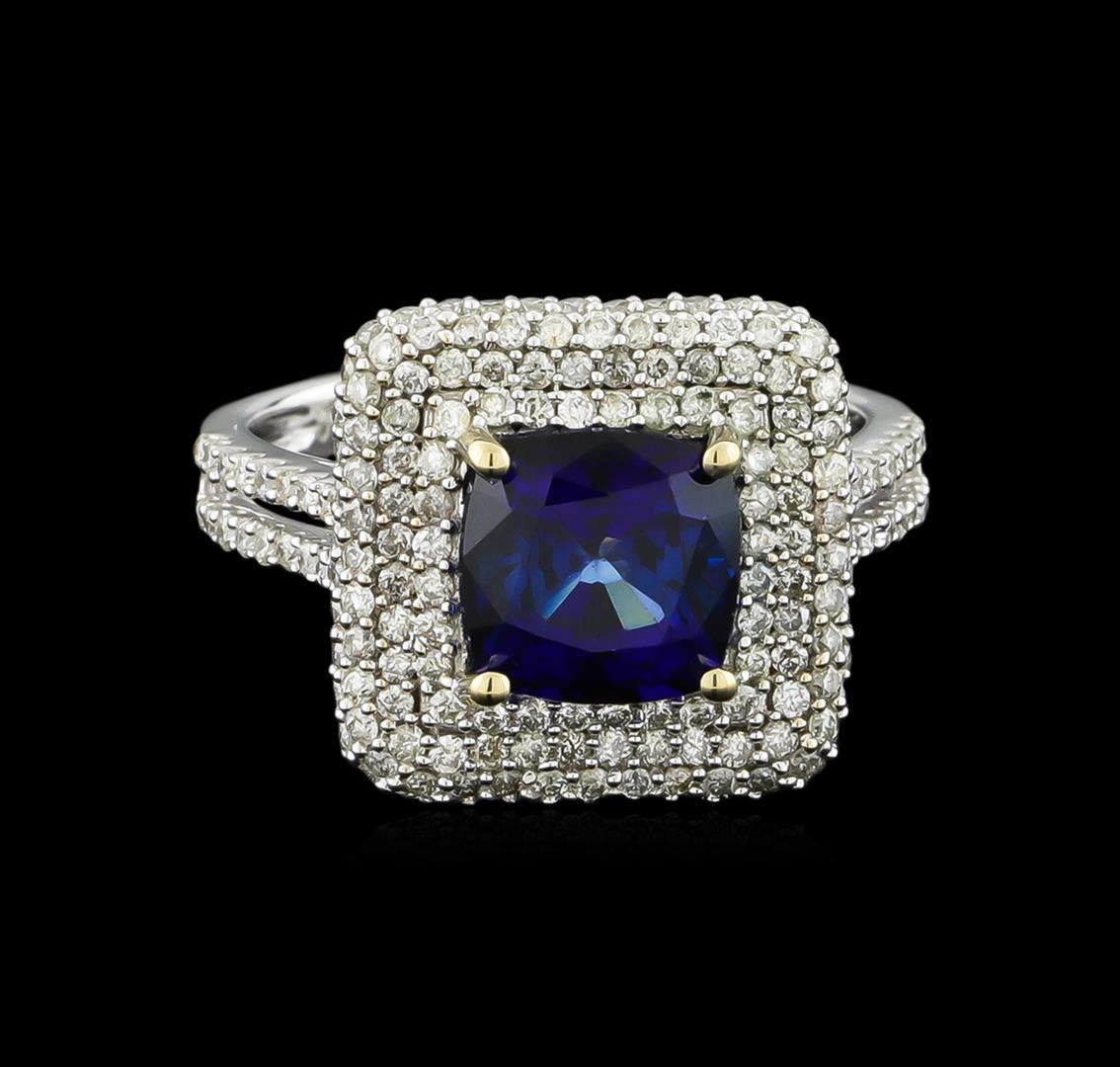 One electronically tested 14KT white gold ladies combination cast & assembled sapphire and diamond ring with a split shank with a bright polish finish. Identified with markings of "14K". Condition is new. Containing: One prong set square cushion modified brilliant cut natural blue sapphire, measuring 7.71 x 7.76 x 5.15mm, approximate weight of 2.90ct., clarity is eye clean, type II, medium dark, moderately strong, blue color, (GIA B 6/4), cut is very good. One Hundred Forty prong set round brilliant cut diamonds, measuring 1.10 - 1.10 x 0.66mm (depth est.) approximate total weight of 140 Stones = 0.67ct. Clarity: I-1 to I-2. Color: I - J, Cut is Good. Colored gemstones are presumed to have been subjected to commonly used enhancement processes. All diamonds and colored gemstones are graded in the mounting, unless otherwise stated. Total Weight of Colored Stones 2.90ct. Total Weight of Diamonds 0.67ct. Total Weight of Ring 5.10 grams. GGL Appraised at $8,080.00.