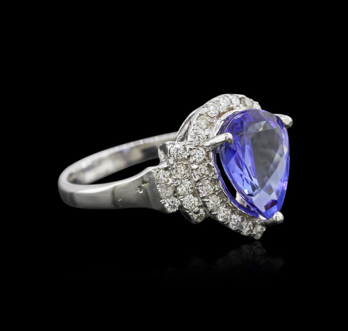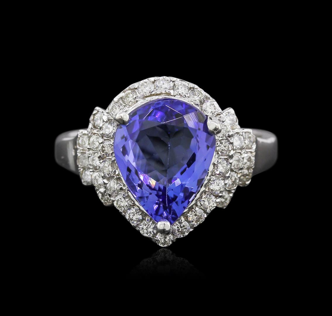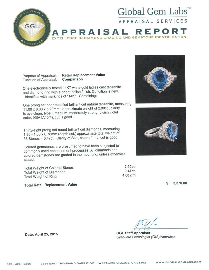 One electronically tested 14KT white gold ladies cast tanzanite and diamond ring with a bright polish finish. Identified with markings of "14K". Condition is new. Containing: One prong set pear modified brilliant cut natural tanzanite, measuring 11.00 x 8.00 x 5.20mm, approximate weight of 2.90ct., clarity is eye clean, type I, medium, moderately strong, bluish violet color, (GIA bV 5/4), cut is good. Thirty-Eight prong set round brilliant cut diamonds, measuring 1.30 - 1.30 x 0.78mm (depth est.) approximate total weight of 38 Stones = 0.47ct. Clarity: SI-1. Color: I - J, Cut is Good. Colored gemstones are presumed to have been subjected to commonly used enhancement processes. All diamonds and colored gemstones are graded in the mounting, unless otherwise stated. Total Weight of Colored Stones 2.90ct. Total Weight of Diamonds 0.47ct. Total Weight of Ring 4.60 grams. GGL Appraised at $3,370.00.