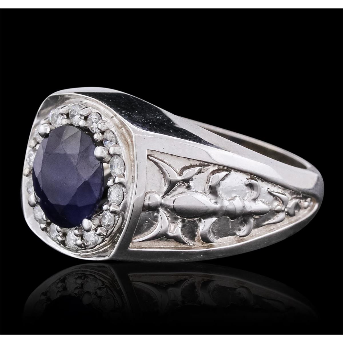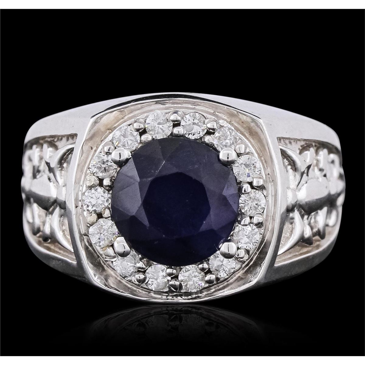 One electronically tested 14KT white gold gents cast sapphire and diamond ring with a bright polish finish. The featured sapphire is set within a diamond bezel supported by tapering fleur-de-lis accented shoulders, completed by a four millimeter wide band. Condition is new, good workmanship. Containing: One prong set round brilliant cut natural blue sapphire, measuring 9.30 - 9.25 x 3.95 mm, 6% bulge factor, approximate weight of 2.90ct., clarity is heavily included, type II, dark, very slightly grayish, violetish blue color, (GIA vB 7/3), cut is good. Transmitting light somewhat diffusely, translucent. Naturally occurring internal & external characteristics are present. Indications of multiple laboratory enhancements, including high temperature diffusion treatment. Graded in the setting. Fourteen prong set round brilliant cut diamonds, measuring 2.10 - 2.00 x 1.23mm (depth est.) approximate total weight of 14 Stones = 0.54ct. Graded in the setting. Clarity: I-1 to I-2 . Color: H - J. Total Weight of Colored Stones 2.90ct.. Total Weight of Diamonds 0.54ct.. Total Weight of Ring 15.92 grams. AIG Appraised at $4,745.00.