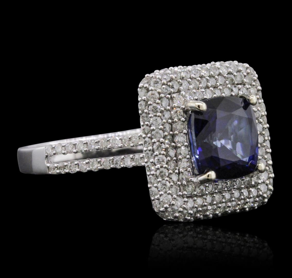 One electronically tested 14KT white gold ladies combination cast & assembled sapphire and diamond ring with a split shank with a bright polish finish. Identified with markings of "14K". Condition is new. Containing: One prong set square cushion modified brilliant cut natural blue sapphire, measuring 7.71 x 7.76 x 5.15mm, approximate weight of 2.90ct., clarity is eye clean, type II, medium dark, moderately strong, blue color, (GIA B 6/4), cut is very good. One Hundred Forty prong set round brilliant cut diamonds, measuring 1.10 - 1.10 x 0.66mm (depth est.) approximate total weight of 140 Stones = 0.67ct. Clarity: I-1 to I-2. Color: I - J, Cut is Good. Colored gemstones are presumed to have been subjected to commonly used enhancement processes. All diamonds and colored gemstones are graded in the mounting, unless otherwise stated. Total Weight of Colored Stones 2.90ct. Total Weight of Diamonds 0.67ct. Total Weight of Ring 5.10 grams. GGL Appraised at $8,080.00.