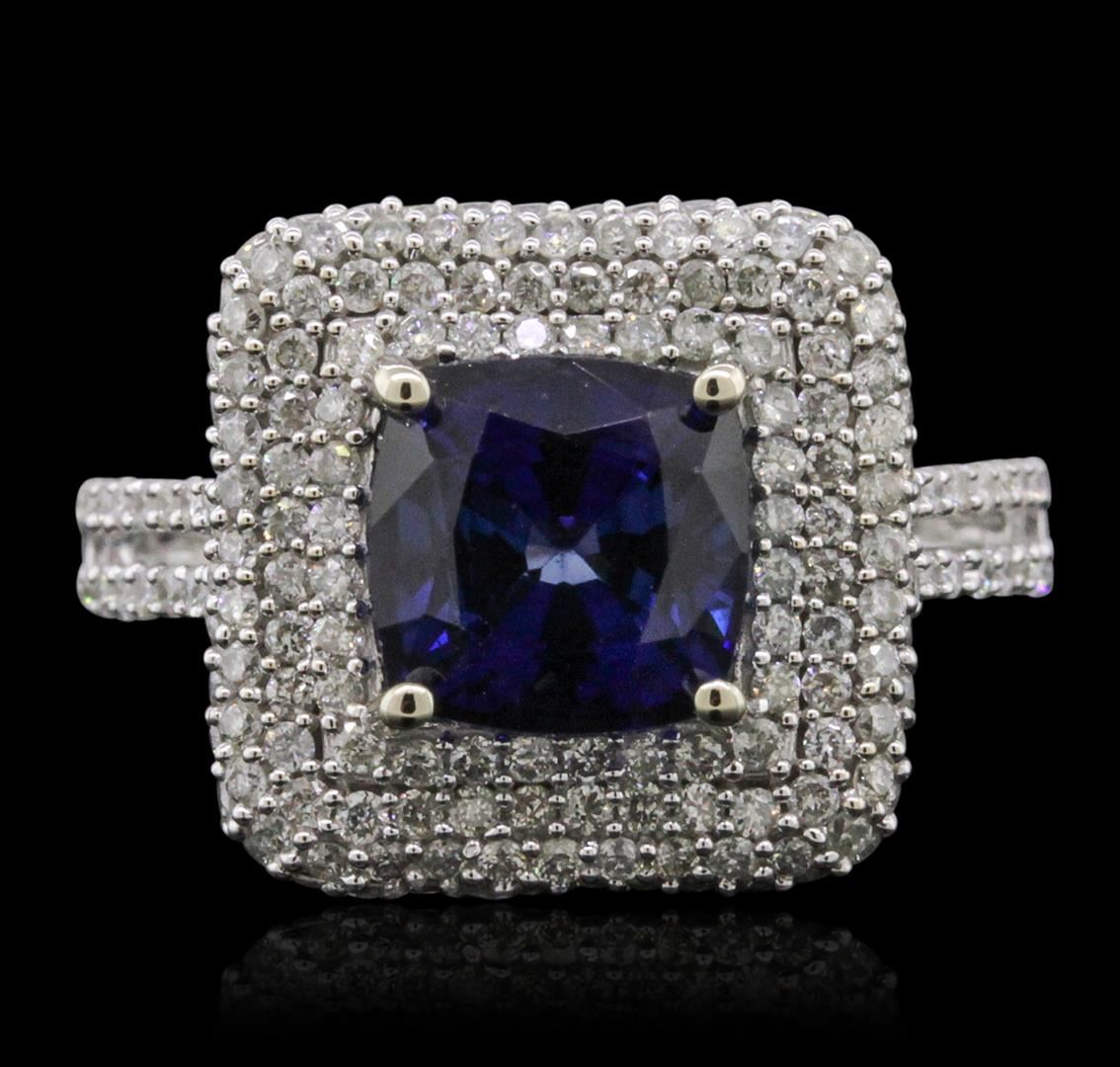 One electronically tested 14KT white gold ladies combination cast & assembled sapphire and diamond ring with a split shank with a bright polish finish. Identified with markings of "14K". Condition is new. Containing: One prong set square cushion modified brilliant cut natural blue sapphire, measuring 7.71 x 7.76 x 5.15mm, approximate weight of 2.90ct., clarity is eye clean, type II, medium dark, moderately strong, blue color, (GIA B 6/4), cut is very good. One Hundred Forty prong set round brilliant cut diamonds, measuring 1.10 - 1.10 x 0.66mm (depth est.) approximate total weight of 140 Stones = 0.67ct. Clarity: I-1 to I-2. Color: I - J, Cut is Good. Colored gemstones are presumed to have been subjected to commonly used enhancement processes. All diamonds and colored gemstones are graded in the mounting, unless otherwise stated. Total Weight of Colored Stones 2.90ct. Total Weight of Diamonds 0.67ct. Total Weight of Ring 5.10 grams. GGL Appraised at $8,080.00.
