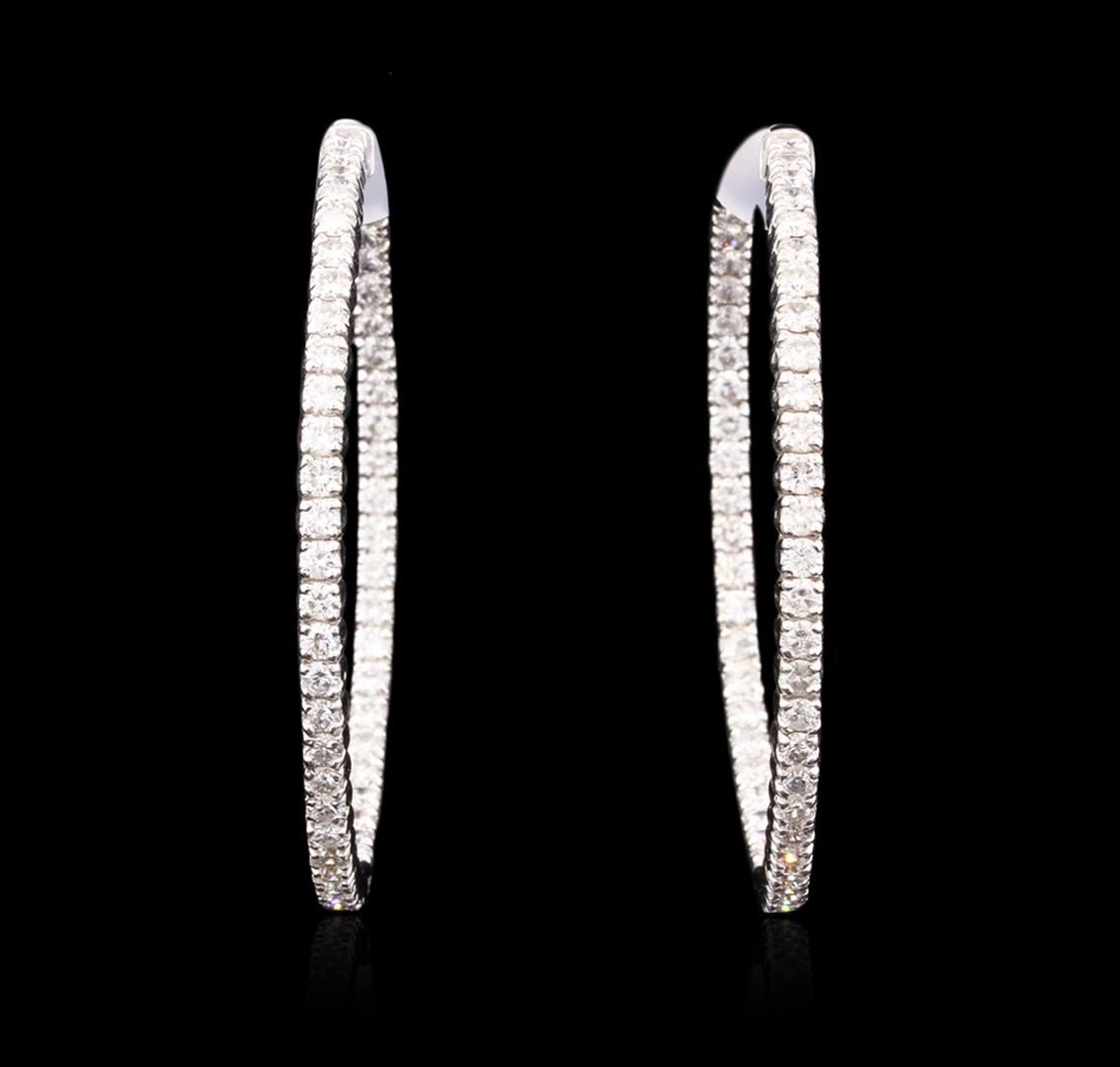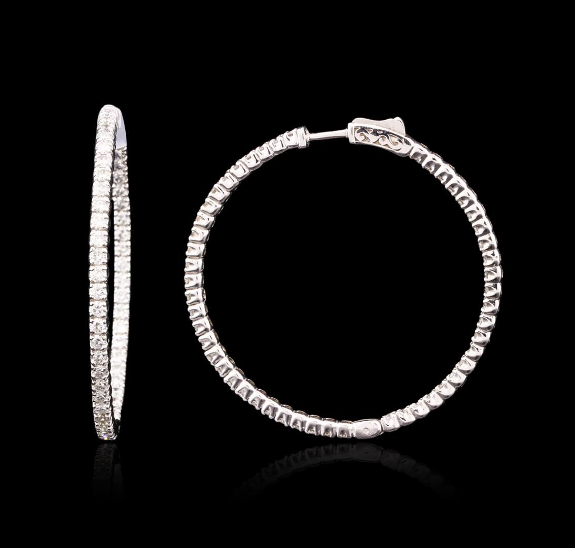 One pair electronically tested 14KT white gold ladies combination cast & assembled hoop style earrings with lever backs with a bright polish finish. Condition is new. Containing: One Hundred prong set round brilliant cut diamonds, measuring 2.00 - 2.00 x 1.20mm (depth est.) approximate total weight of 100 Stones = 2.92ct. Clarity: SI-1 to I-1. Color: I - J, Cut is Good. All diamonds are graded in the mounting, unless otherwise stated. Total Weight of Diamonds 2.92ct. Total Weight of Earrings 13.70 grams. GGL Appraised at $7,740.00.