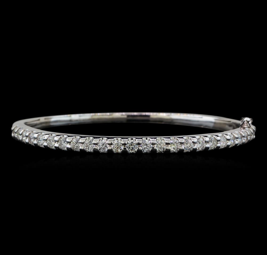 One electronically tested 14KT white gold ladies cast diamond bangle bracelet with a hidden box clasp with safety closer with a bright polish finish. Identified with markings of "14K". Condition is new. Containing: Twenty-Four prong set round brilliant cut diamonds, measuring 3.00 - 3.00 x 1.80mm (depth est.) approximate total weight of 24 Stones = 2.93ct. Clarity: SI-1 to I-1. Color: H - J, Cut is Good. All diamonds are graded in the mounting, unless otherwise stated. Total Weight of Diamonds 2.93ct. Total Weight of Bangle Bracelet 14.80 grams. GGL Appraised at $8,760.00.