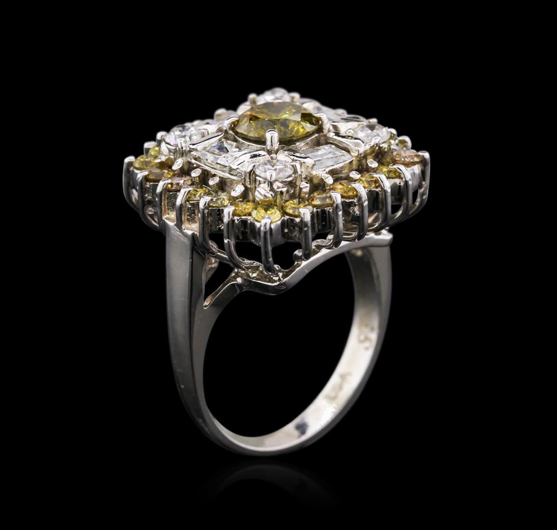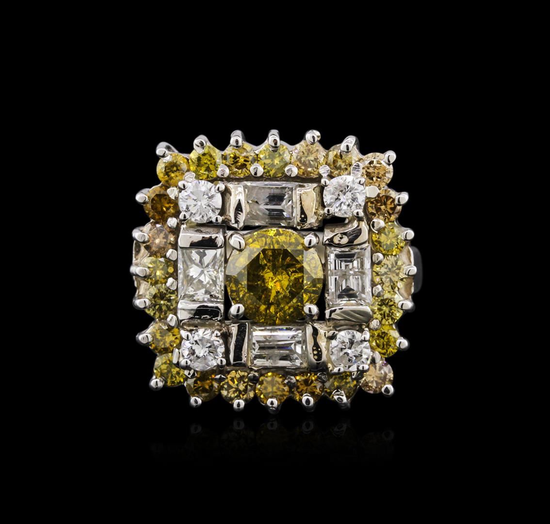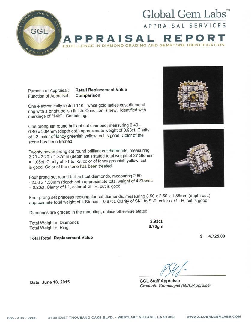 One electronically tested 14KT white gold ladies cast diamond ring with a bright polish finish. Identified with markings of "14K". Condition is new. Containing: One prong set round brilliant cut diamond, measuring 6.40 - 6.40 x 0.00mm (depth est.) approximate weight of 0.00ct. Clarity: I-2, Cut is Good. Color of the stone has been treated. Twenty-Seven prong set round brilliant cut diamonds, measuring 2.20 - 2.20 x 1.32mm (depth est.) stated. Total Weight of 27 Stones = 1.05ct. Clarity: I-1 to I-2, Cut is Good. Color of the stone has been treated. Four prong set round brilliant cut diamonds, measuring 2.50 - 2.50 x 1.50mm (depth est.) approximate total weight of 4 Stones = 0.23ct. Clarity: I-1. Color: G - H, Cut is Good. Four prong set princess rectangular cut diamonds, measuring 3.50 x 2.50 x 1.88mm (depth est.) approximate total weight of 4 Stones = 0.67ct. Clarity: SI-1 to SI-2. Color: G - H, Cut is Good. Diamonds are graded in the mounting, unless otherwise stated. Total Weight of Diamonds 1.95ct. Total Weight of Ring 8.70 grams. GGL Appraised at $4,765.00.