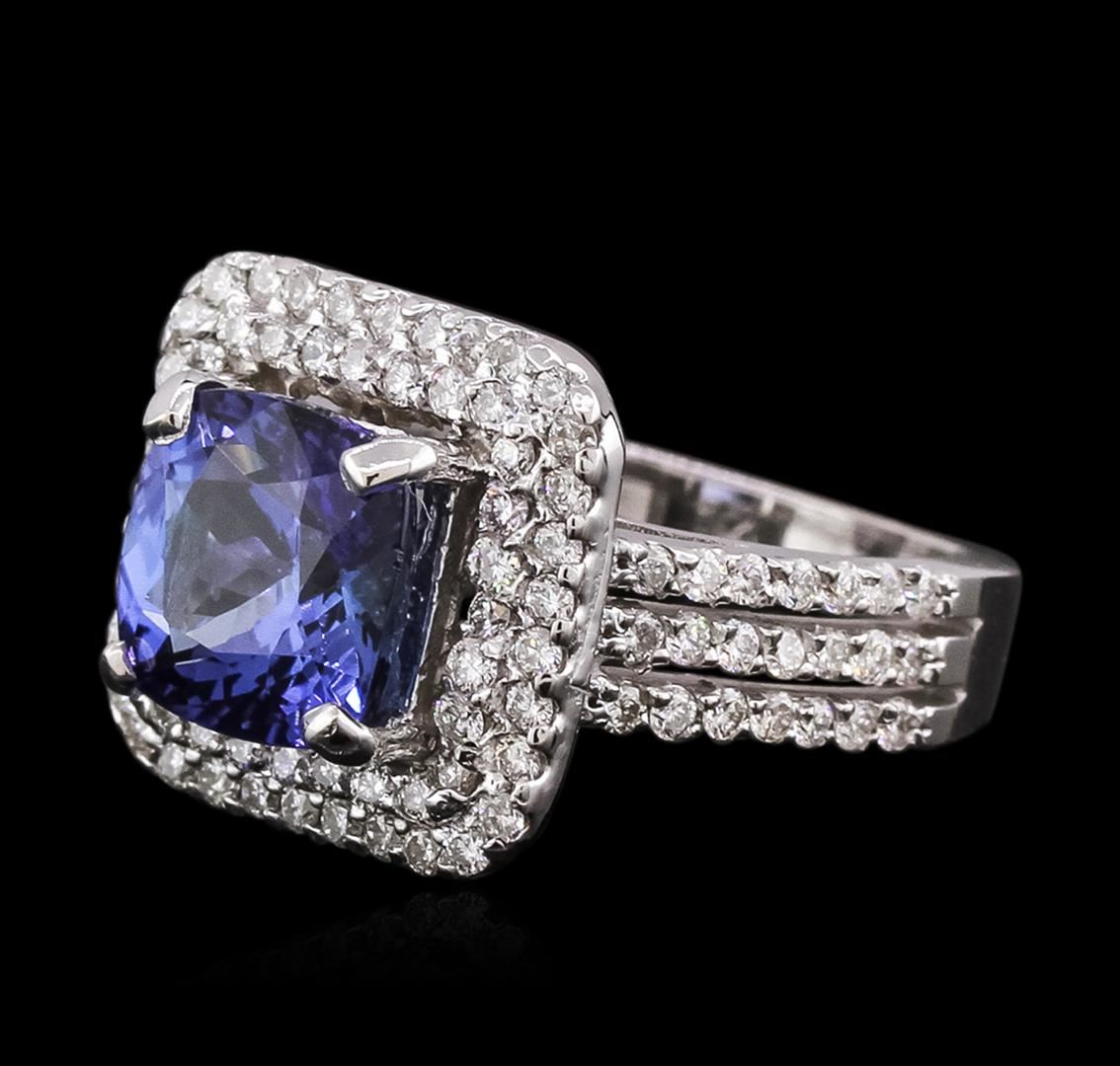 One electronically tested 14KT white gold ladies cast tanzanite and diamond ring with a bright polish finish. Identified with markings of "14KT". Condition is new. Containing: One prong set square cushion modified brilliant cut natural tanzanite, measuring 8.30 x 8.30 x 5.40mm, approximate weight of 2.93ct., clarity is eye clean, type I, medium, very slightly grayish, violet color, (GIA V 5/3), cut is very good. One Hundred Four prong set round brilliant cut diamonds, measuring 1.40 - 1.40 x 0.84mm (depth est.) approximate total weight of 104 Stones = 1.04ct. Clarity: SI-2 to SI-1. Color: I - J, Cut is Good. Colored gemstones are presumed to have been subjected to commonly used enhancement processes. All diamonds and colored gemstones are graded in the mounting, unless otherwise stated. Total Weight of Colored Stones 2.93ct. Total Weight of Diamonds 1.04ct. Total Weight of Ring 6.90 grams. GGL Appraised at $5,825.00.