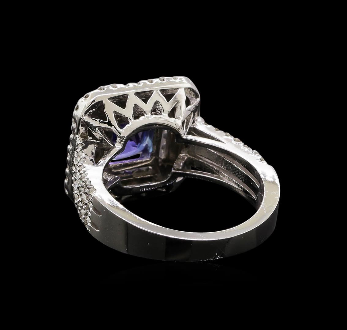 One electronically tested 14KT white gold ladies cast tanzanite and diamond ring with a bright polish finish. Identified with markings of "14KT". Condition is new. Containing: One prong set square cushion modified brilliant cut natural tanzanite, measuring 8.30 x 8.30 x 5.40mm, approximate weight of 2.93ct., clarity is eye clean, type I, medium, very slightly grayish, violet color, (GIA V 5/3), cut is very good. One Hundred Four prong set round brilliant cut diamonds, measuring 1.40 - 1.40 x 0.84mm (depth est.) approximate total weight of 104 Stones = 1.04ct. Clarity: SI-2 to SI-1. Color: I - J, Cut is Good. Colored gemstones are presumed to have been subjected to commonly used enhancement processes. All diamonds and colored gemstones are graded in the mounting, unless otherwise stated. Total Weight of Colored Stones 2.93ct. Total Weight of Diamonds 1.04ct. Total Weight of Ring 6.90 grams. GGL Appraised at $5,825.00.