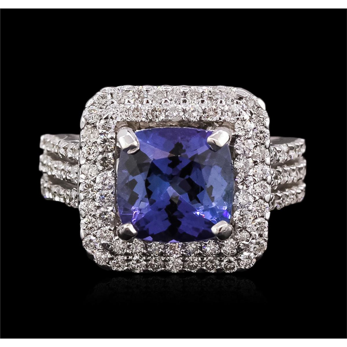 One electronically tested 14KT white gold ladies cast tanzanite and diamond ring with a bright polish finish. Identified with markings of "14KT". Condition is new. Containing: One prong set square cushion modified brilliant cut natural tanzanite, measuring 8.30 x 8.30 x 5.40mm, approximate weight of 2.93ct., clarity is eye clean, type I, medium, very slightly grayish, violet color, (GIA V 5/3), cut is very good. One Hundred Four prong set round brilliant cut diamonds, measuring 1.40 - 1.40 x 0.84mm (depth est.) approximate total weight of 104 Stones = 1.04ct. Clarity: SI-2 to SI-1. Color: I - J, Cut is Good. Colored gemstones are presumed to have been subjected to commonly used enhancement processes. All diamonds and colored gemstones are graded in the mounting, unless otherwise stated. Total Weight of Colored Stones 2.93ct. Total Weight of Diamonds 1.04ct. Total Weight of Ring 6.90 grams. GGL Appraised at $5,825.00.