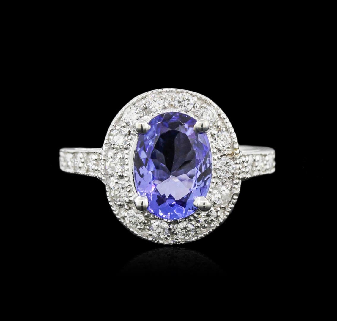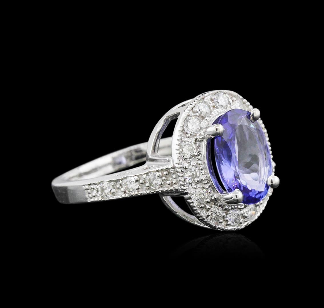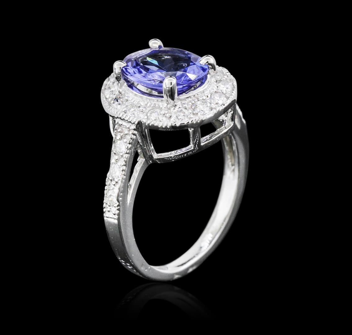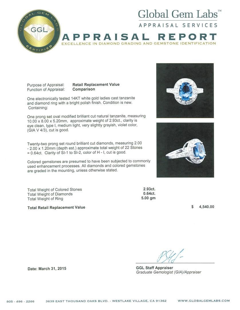 One electronically tested 14KT white gold ladies cast tanzanite and diamond ring with a bright polish finish. Condition is new. Containing: One prong set oval modified brilliant cut natural tanzanite, measuring 10.00 x 8.00 x 5.20mm, approximate weight of 2.93ct., clarity is eye clean, type I, medium light, very slightly grayish, violet color, (GIA V 4/3), cut is good. Twenty-Two prong set round brilliant cut diamonds, measuring 2.00 - 2.00 x 1.20mm (depth est.) approximate total weight of 22 Stones = 0.64ct. Clarity: SI-1 to SI-2. Color: H - I, Cut is Good. Colored gemstones are presumed to have been subjected to commonly used enhancement processes. All diamonds and colored gemstones are graded in the mounting, unless otherwise stated. Total Weight of Colored Stones 2.93ct. Total Weight of Diamonds 0.64ct. Total Weight of Ring 5.00 grams. GGL Appraised at $4,540.00.