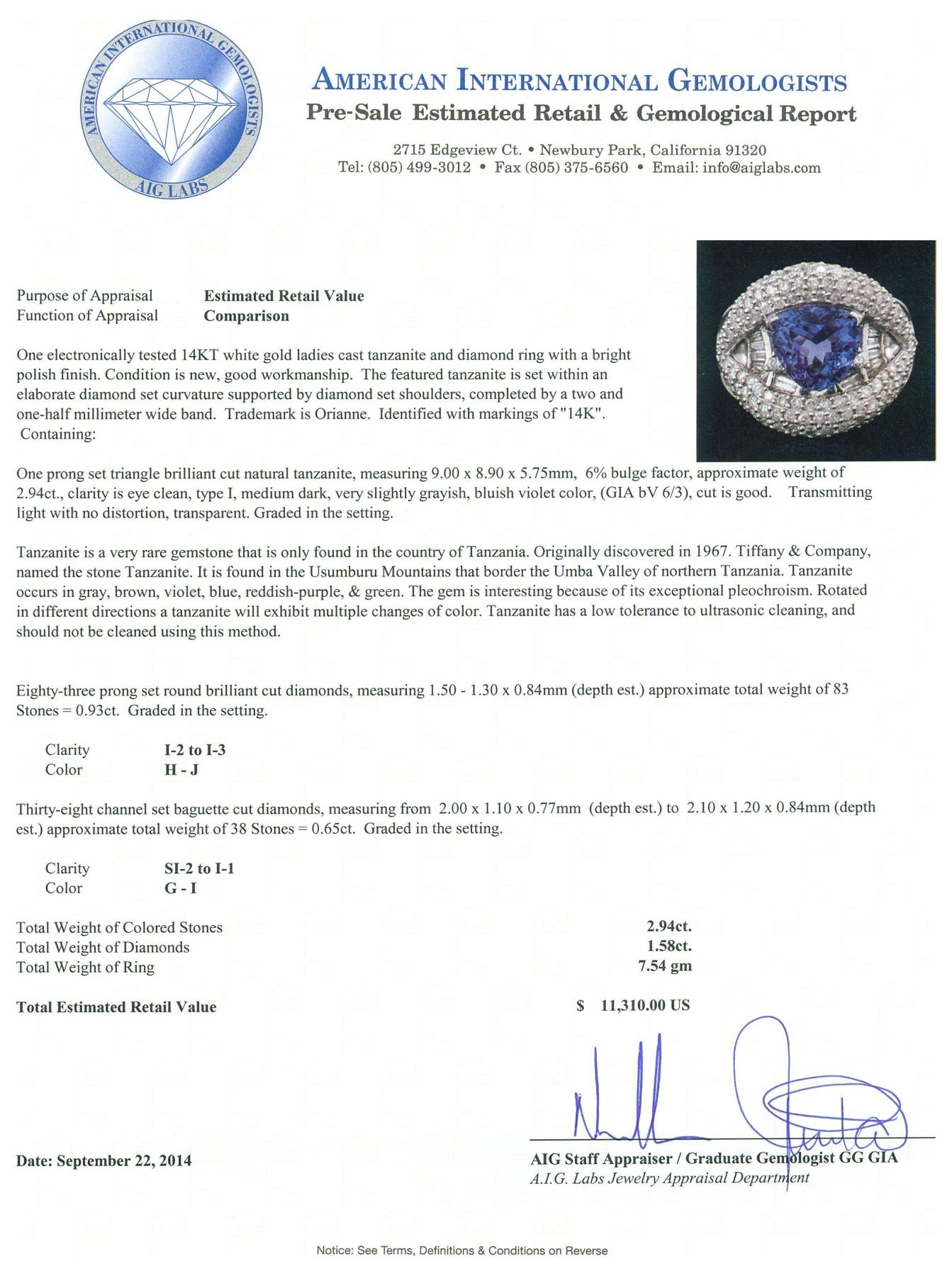 One electronically tested 14KT white gold ladies cast tanzanite and diamond ring with a bright polish finish. The featured tanzanite is set within an elaborate diamond set curvature supported by diamond set shoulders, completed by a two and one-half millimeter wide band. Trademark is Orianne. Identified with markings of "14K". Condition is new, good workmanship. Containing: One prong set triangle brilliant cut natural tanzanite, measuring 9.00 x 8.90 x 5.75mm, 6% bulge factor, approximate weight of 2.94ct., clarity is eye clean, type I, medium dark, very slightly grayish, bluish violet color, (GIA bV 6/3), cut is good. Transmitting light with no distortion, transparent. Graded in the setting. Tanzanite is a very rare gemstone that is only found in the country of Tanzania. Originally discovered in 1967. Tiffany & Company, named the stone Tanzanite. It is found in the Usumburu Mountains that border the Umba Valley of northern Tanzania. Tanzanite occurs in gray, brown, violet, blue, reddish-purple, & green. The gem is interesting because of its exceptional pleochroism. Rotated in different directions a tanzanite will exhibit multiple changes of color. Tanzanite has a low tolerance to ultrasonic cleaning, and should not be cleaned using this method. Eighty-Three prong set round brilliant cut diamonds, measuring 1.50 - 1.30 x 0.84mm (depth est.) approximate total weight of 83 Stones = 0.93ct. Graded in the setting. Clarity: I-2 to I-3. Color: H - J Thirty-Eight channel set baguette cut diamonds, measuring from 2.00 x 1.10 x 0.77mm (depth est.) to 2.10 x 1.20 x 0.84mm (depth est.) approximate total weight of 38 Stones = 0.65ct. Graded in the setting. Clarity: SI-2 to I-1. Color: G - I. Total Weight of Colored Stones 2.94ct. Total Weight of Diamonds 1.58ct. Total Weight of Ring 7.54 grams. AIG Appraised.