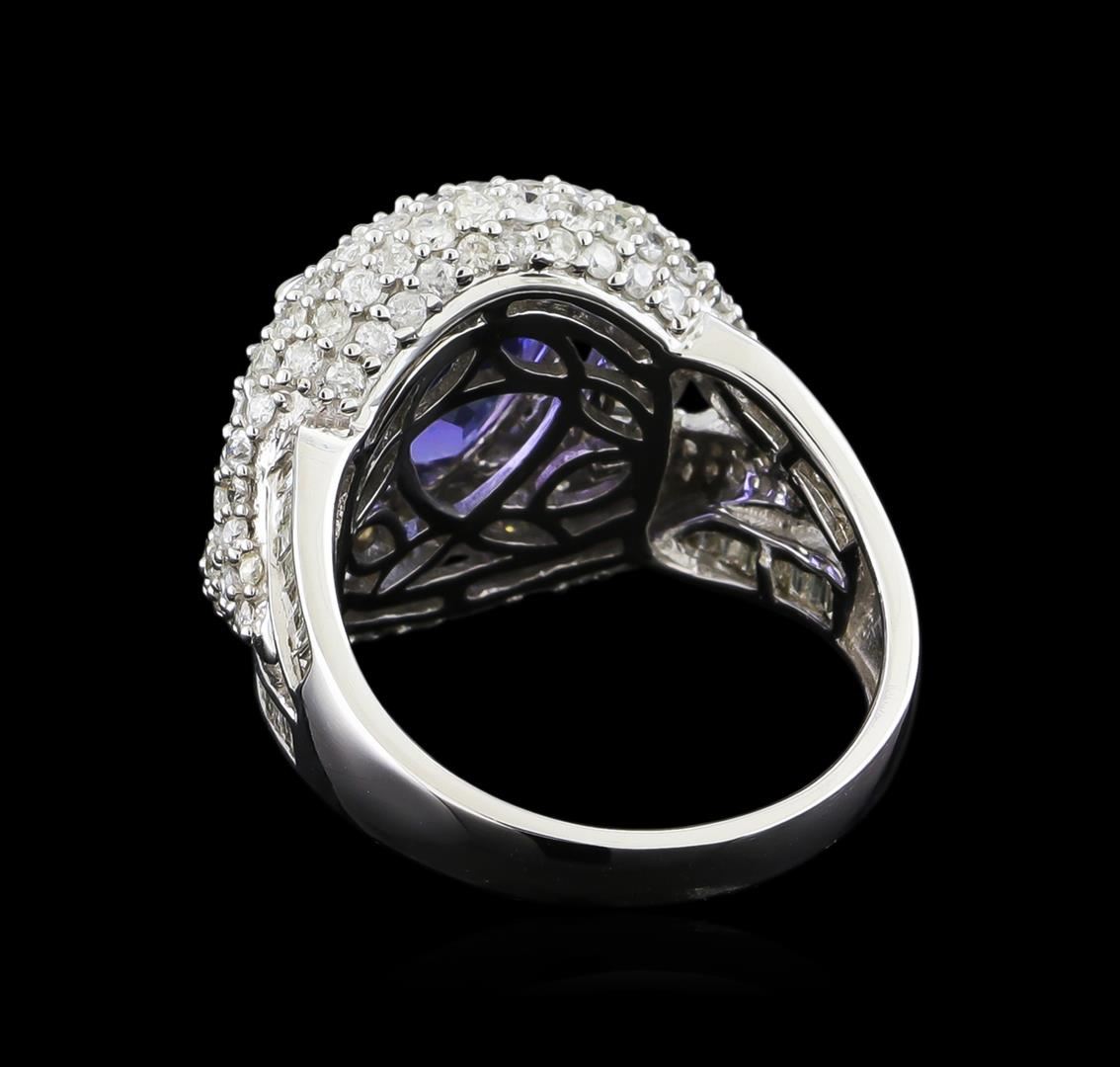 One electronically tested 14KT white gold ladies cast tanzanite and diamond ring with a bright polish finish. The featured tanzanite is set within an elaborate diamond set curvature supported by diamond set shoulders, completed by a two and one-half millimeter wide band. Trademark is Orianne. Identified with markings of "14K". Condition is new, good workmanship. Containing: One prong set triangle brilliant cut natural tanzanite, measuring 9.00 x 8.90 x 5.75mm, 6% bulge factor, approximate weight of 2.94ct., clarity is eye clean, type I, medium dark, very slightly grayish, bluish violet color, (GIA bV 6/3), cut is good. Transmitting light with no distortion, transparent. Graded in the setting. Tanzanite is a very rare gemstone that is only found in the country of Tanzania. Originally discovered in 1967. Tiffany & Company, named the stone Tanzanite. It is found in the Usumburu Mountains that border the Umba Valley of northern Tanzania. Tanzanite occurs in gray, brown, violet, blue, reddish-purple, & green. The gem is interesting because of its exceptional pleochroism. Rotated in different directions a tanzanite will exhibit multiple changes of color. Tanzanite has a low tolerance to ultrasonic cleaning, and should not be cleaned using this method. Eighty-Three prong set round brilliant cut diamonds, measuring 1.50 - 1.30 x 0.84mm (depth est.) approximate total weight of 83 Stones = 0.93ct. Graded in the setting. Clarity: I-2 to I-3. Color: H - J Thirty-Eight channel set baguette cut diamonds, measuring from 2.00 x 1.10 x 0.77mm (depth est.) to 2.10 x 1.20 x 0.84mm (depth est.) approximate total weight of 38 Stones = 0.65ct. Graded in the setting. Clarity: SI-2 to I-1. Color: G - I. Total Weight of Colored Stones 2.94ct. Total Weight of Diamonds 1.58ct. Total Weight of Ring 7.54 grams. AIG Appraised.