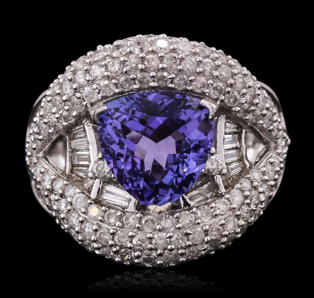 One electronically tested 14KT white gold ladies cast tanzanite and diamond ring with a bright polish finish. The featured tanzanite is set within an elaborate diamond set curvature supported by diamond set shoulders, completed by a two and one-half millimeter wide band. Trademark is Orianne. Identified with markings of "14K". Condition is new, good workmanship. Containing: One prong set triangle brilliant cut natural tanzanite, measuring 9.00 x 8.90 x 5.75mm, 6% bulge factor, approximate weight of 2.94ct., clarity is eye clean, type I, medium dark, very slightly grayish, bluish violet color, (GIA bV 6/3), cut is good. Transmitting light with no distortion, transparent. Graded in the setting. Tanzanite is a very rare gemstone that is only found in the country of Tanzania. Originally discovered in 1967. Tiffany & Company, named the stone Tanzanite. It is found in the Usumburu Mountains that border the Umba Valley of northern Tanzania. Tanzanite occurs in gray, brown, violet, blue, reddish-purple, & green. The gem is interesting because of its exceptional pleochroism. Rotated in different directions a tanzanite will exhibit multiple changes of color. Tanzanite has a low tolerance to ultrasonic cleaning, and should not be cleaned using this method. Eighty-Three prong set round brilliant cut diamonds, measuring 1.50 - 1.30 x 0.84mm (depth est.) approximate total weight of 83 Stones = 0.93ct. Graded in the setting. Clarity: I-2 to I-3. Color: H - J Thirty-Eight channel set baguette cut diamonds, measuring from 2.00 x 1.10 x 0.77mm (depth est.) to 2.10 x 1.20 x 0.84mm (depth est.) approximate total weight of 38 Stones = 0.65ct. Graded in the setting. Clarity: SI-2 to I-1. Color: G - I. Total Weight of Colored Stones 2.94ct. Total Weight of Diamonds 1.58ct. Total Weight of Ring 7.54 grams. AIG Appraised at $11,310.00.