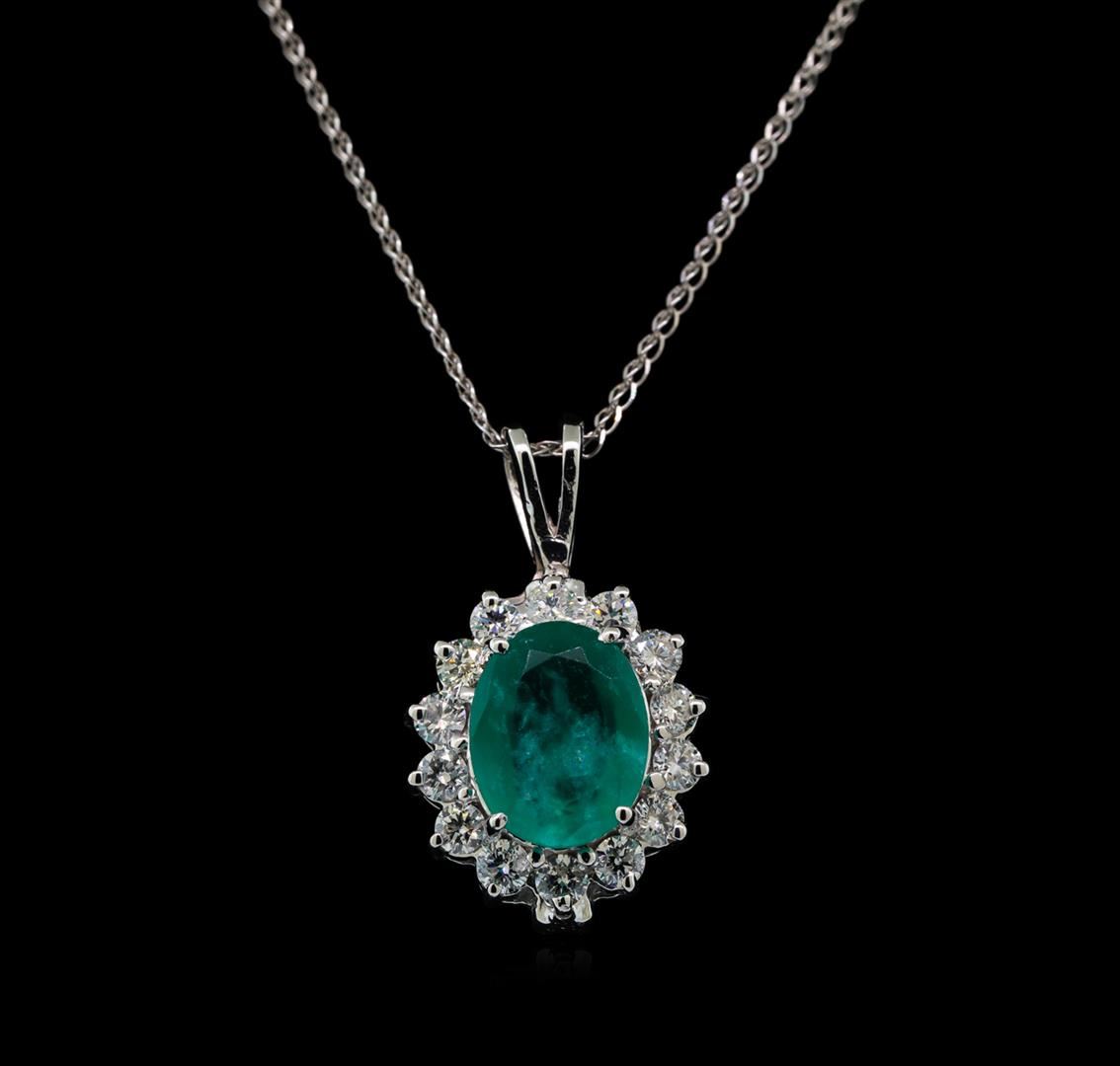 One electronically tested 14KT white gold ladies cast chalcedony and diamond pendant & chain 18.0" long, with a spring ring clasp with a bright polish finish. Identified with markings of "14K". Condition is new. Containing: One prong set oval oval modified brilliant cut natural chrysoprase, measuring 10.50 x 8.00 x 5.20mm, approximate weight of 2.95ct., clarity is severely included, medium, moderately strong, very strongly bluish green color, (GIA vstbG 5/4)Fourteen prong set round brilliant cut diamonds, measuring 2.50 - 2.50 x 1.50mm (depth est.) approximate total weight of 14 Stones = 0.80ct. Clarity: SI-1 to I-1. Color: H - I, Cut is Good. Colored gemstones are presumed to have been subjected to commonly used enhancement processes. All diamonds and colored gemstones are graded in the mounting, unless otherwise stated. Total Weight of Colored Stones 2.95ct. Total Weight of Diamonds 0.80ct. Total Weight of Pendant & Chain 4.20 grams. GGL Appraised at $2,195.00.