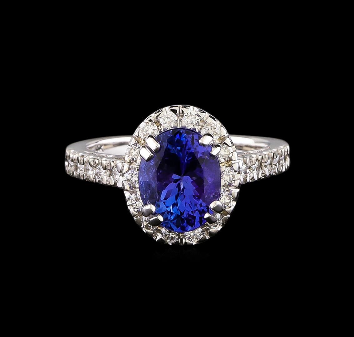One electronically tested 14KT white gold ladies combination cast & assembled tanzanite and diamond ring with a flat shank with a bright polish finish. Identified with markings of "14K". Condition is new. Containing: One prong set oval modified brilliant cut natural tanzanite, measuring 9.43 x 7.40 x 6.00mm, approximate weight of 2.95ct., clarity is eye clean, type I, medium light, moderately strong, violet color, (GIA V 4/4), cut is good. Twenty-Four prong set round brilliant cut diamonds, measuring 1.50 - 1.50 x 0.90mm (depth est.) approximate total weight of 24 Stones = 0.30ct. Clarity: SI-2 to I-1. Color: I - J, Cut is Good. All diamonds and colored gemstones are graded in the mounting, unless otherwise stated. Colored gemstones are presumed to have been subjected to commonly used enhancement processes. Total Weight of Colored Stones 2.95ct. Total Weight of Diamonds 0.30ct. Total Weight of Ring 5.90 grams. GGL Appraised at $5,935.00.