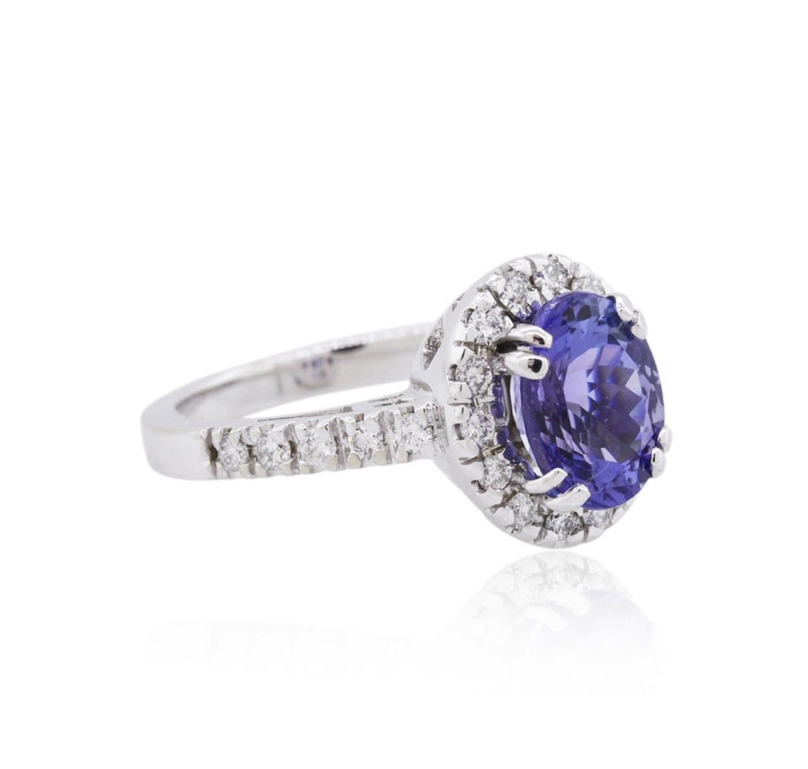 One electronically tested 14KT white gold ladies combination cast & assembled tanzanite and diamond ring with a flat shank with a bright polish finish. Identified with markings of "14K". Condition is new. Containing: One prong set oval modified brilliant cut natural tanzanite, measuring 9.43 x 7.40 x 6.00mm, approximate weight of 2.95ct., clarity is eye clean, type I, medium light, moderately strong, violet color, (GIA V 4/4), cut is good. Twenty-Four prong set round brilliant cut diamonds, measuring 1.50 - 1.50 x 0.90mm (depth est.) approximate total weight of 24 Stones = 0.30ct. Clarity: SI-2 to I-1. Color: I - J, Cut is Good. All diamonds and colored gemstones are graded in the mounting, unless otherwise stated. Colored gemstones are presumed to have been subjected to commonly used enhancement processes. Total Weight of Colored Stones 2.95ct. Total Weight of Diamonds 0.30ct. Total Weight of Ring 5.90 grams. GGL Appraised at $5,935.00.