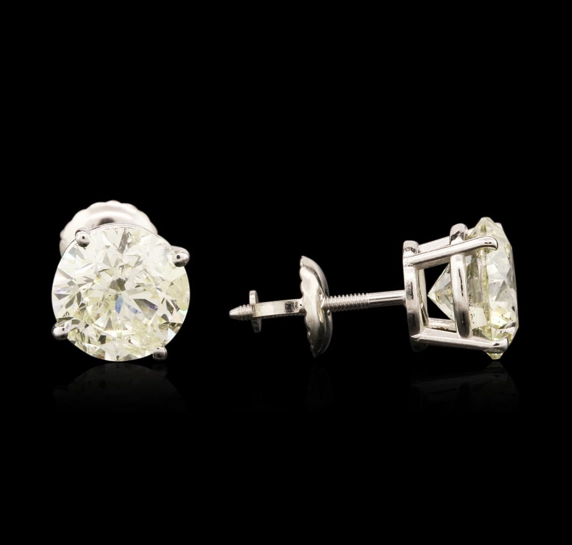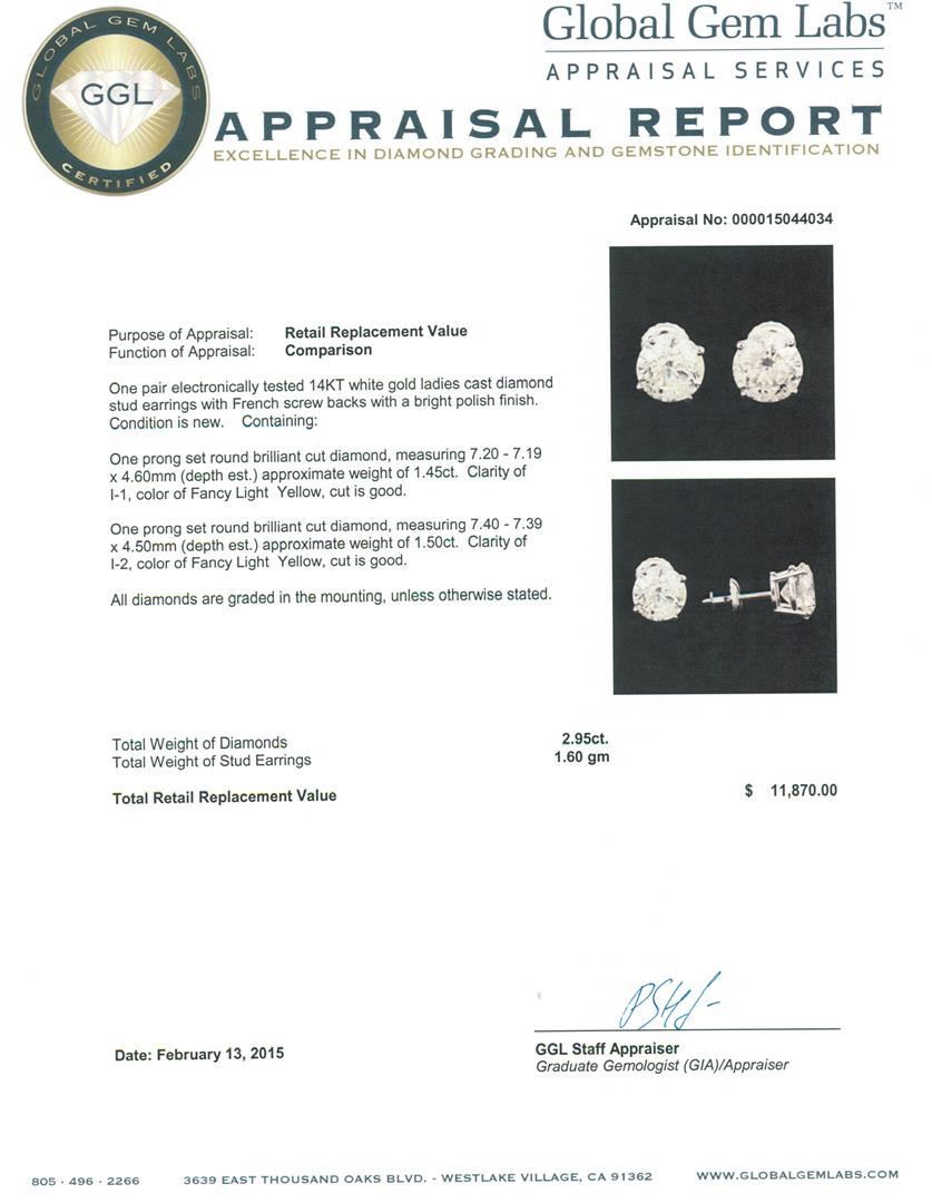 One pair electronically tested 14KT white gold ladies cast diamond stud earrings with French screw backs with a bright polish finish. Condition is new. Containing: One prong set round brilliant cut diamond, measuring 7.20 - 7.19 x 4.60mm (depth est.) approximate weight of 1.45ct. Clarity: I-1, Cut is Good. One prong set round brilliant cut diamond, measuring 7.40 - 7.39 x 4.50mm (depth est.) approximate weight of 1.50ct. Clarity: I-2, Cut is Good. All diamonds are graded in the mounting, unless otherwise stated. Total Weight of Diamonds 2.95ct. Total Weight of Stud Earrings 1.60 grams. GGL Appraised at $11,870.00.