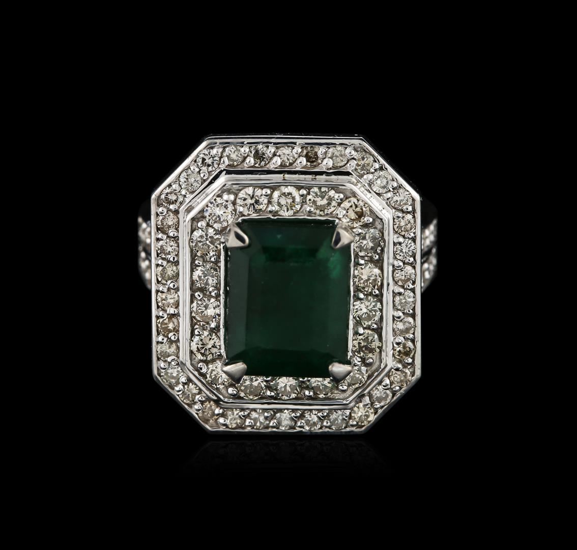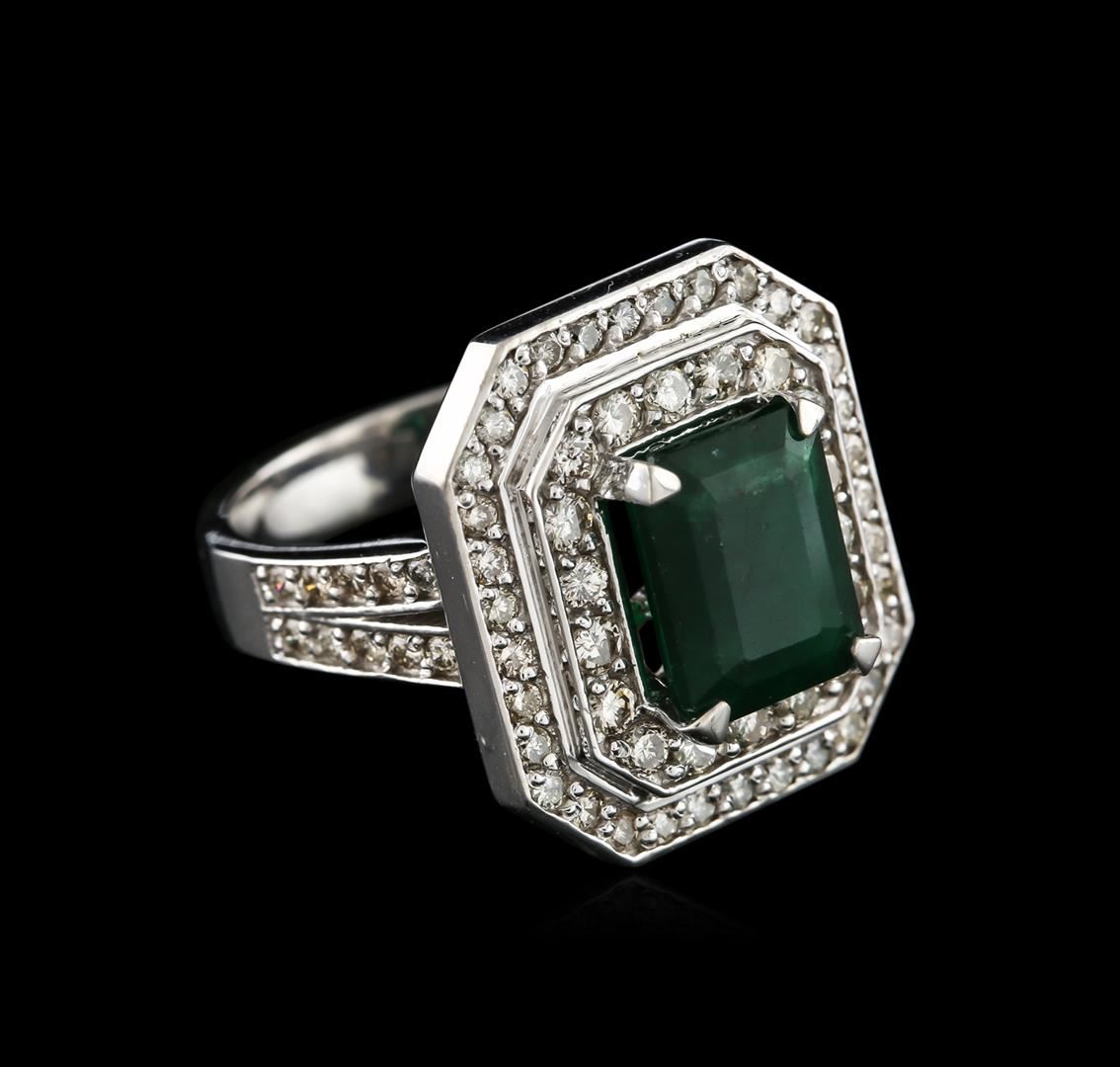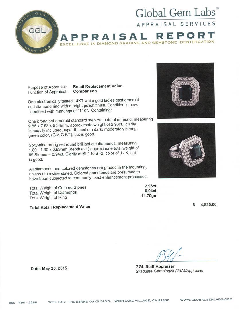 One electronically tested 14KT white gold ladies cast emerald and diamond ring with a bright polish finish. Identified with markings of "14K". Condition is new. Containing: One prong set emerald standard step cut natural emerald, measuring 9.88 x 7.63 x 5.34mm, approximate weight of 2.96ct., clarity is heavily included, type III, medium dark, moderately strong, green color, (GIA G 6/4), cut is good. Sixty-Nine prong set round brilliant cut diamonds, measuring 1.80 - 1.30 x 0.93mm (depth est.) approximate total weight of 69 Stones = 0.94ct. Clarity: SI-1 to SI-2. Color: J - K, Cut is Good. All diamonds and colored gemstones are graded in the mounting, unless otherwise stated. Colored gemstones are presumed to have been subjected to commonly used enhancement processes. Total Weight of Colored Stones 2.96ct. Total Weight of Diamonds 0.94ct. Total Weight of Ring 11.70 grams. GGL Appraised at $4,835.00.